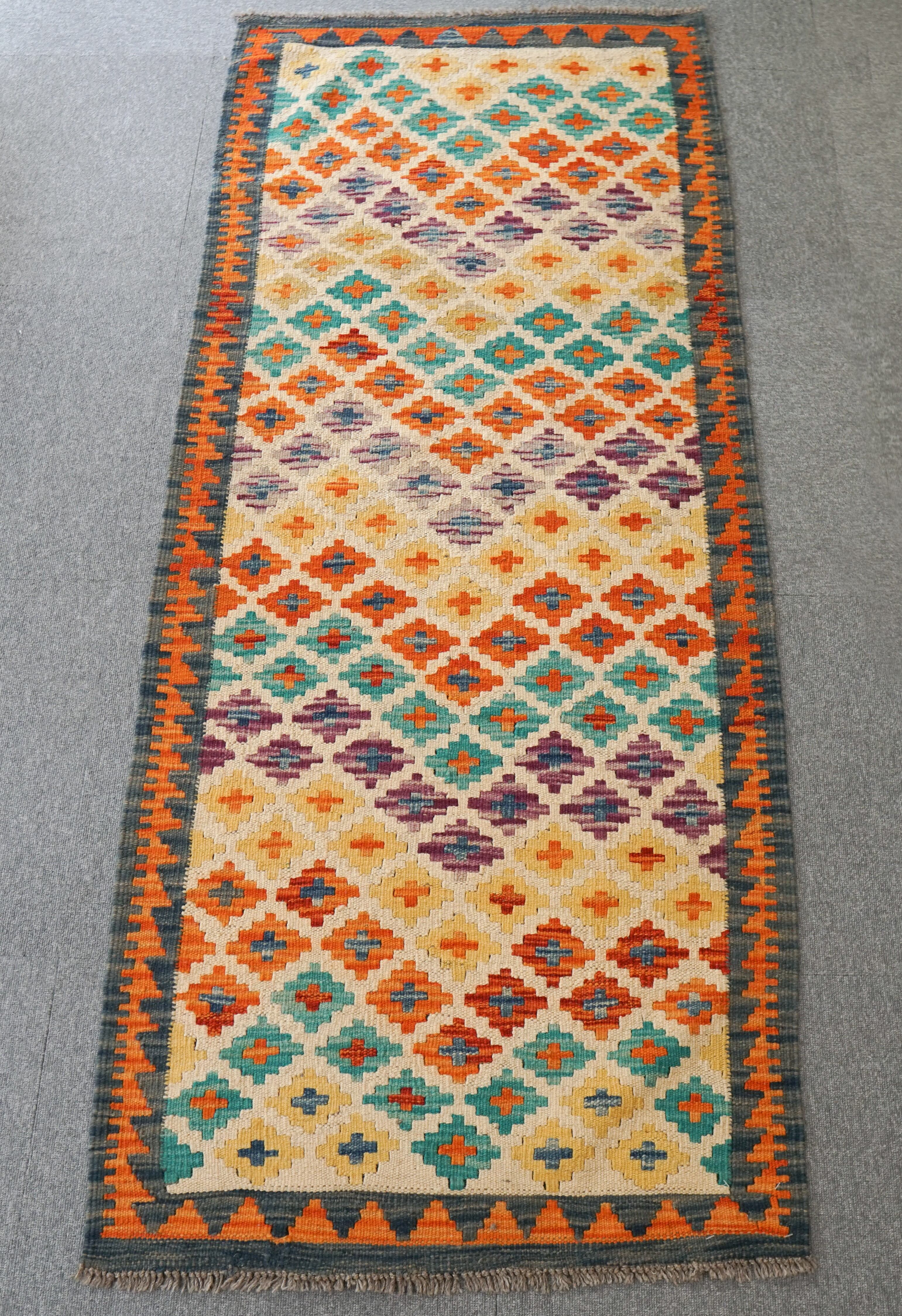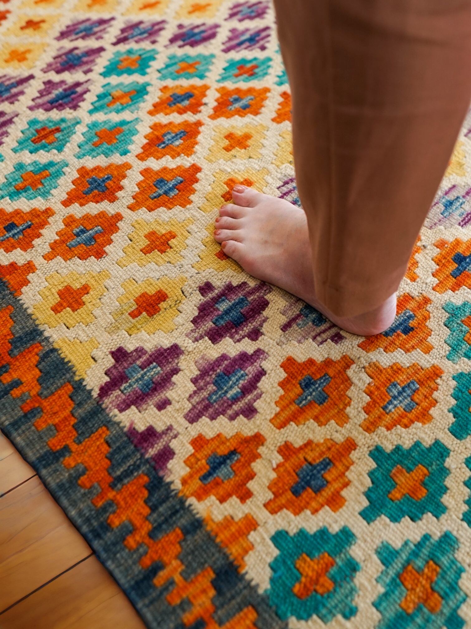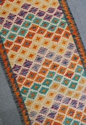 アフガニスタン中央の山間部で生活する遊牧民によって織られたキリム。キリムとは、トルコ、イラン、アフガニスタンを主な産地とする毛足のない平織りのトライバルラグで、汚れれば水洗いをし、破れれば修理をしたり袋物に作り変えたりと現地では大切に使われています。