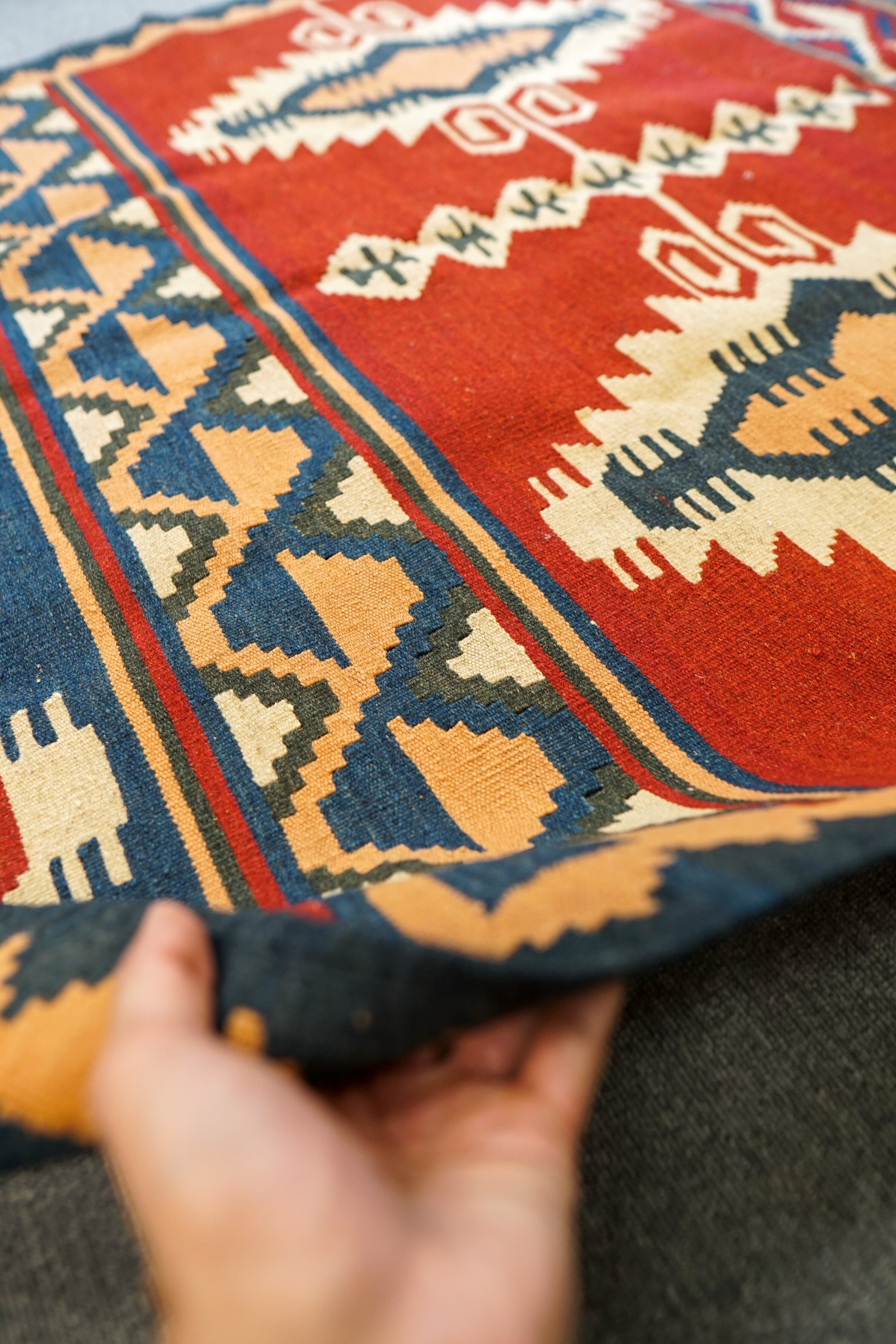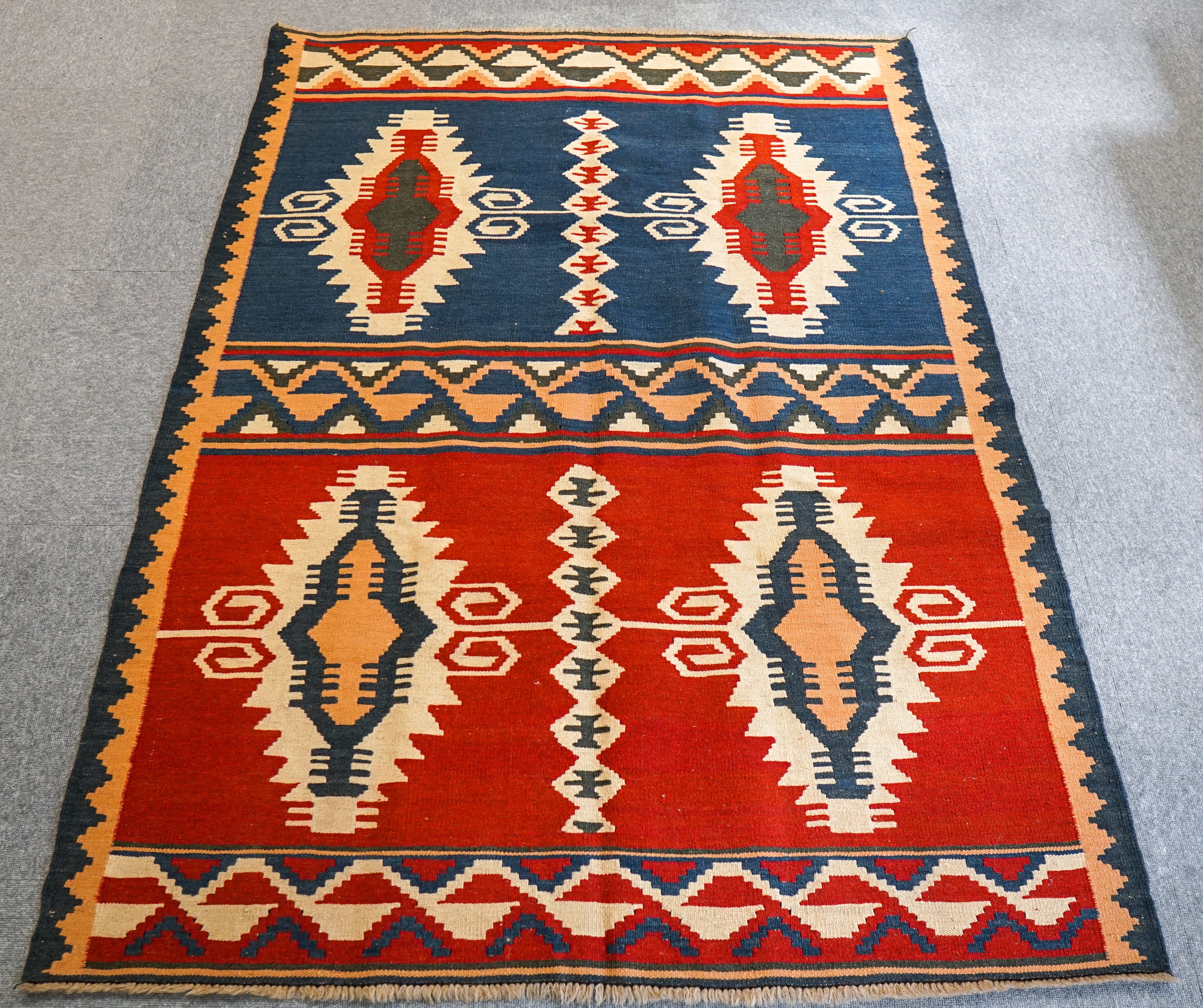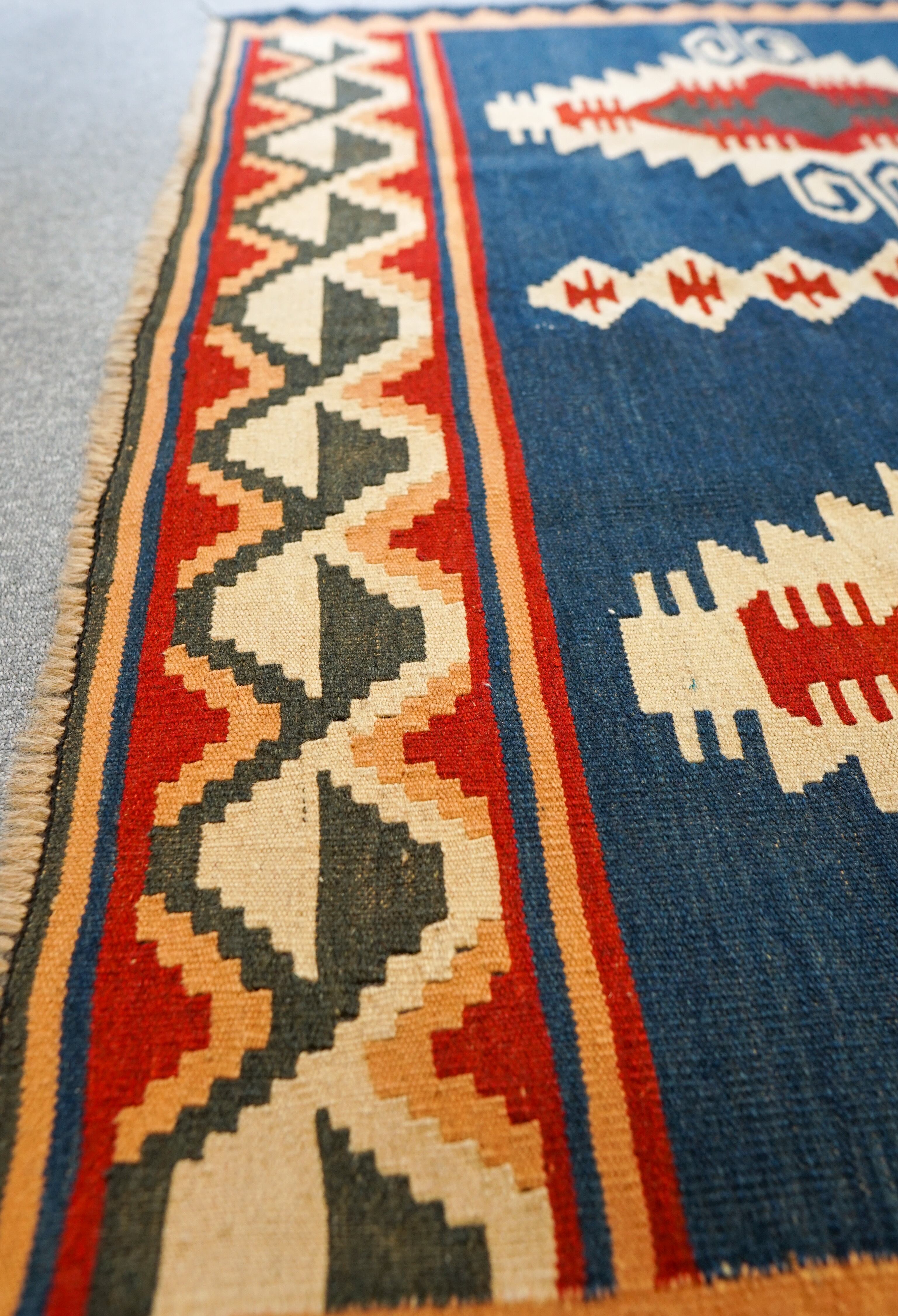 草木染めしたウールを使用し、イランの遊牧民によりつくられた手織りキリム。毛足のない平織りの絨毯です。素材はウールですが、さらっとした麻のような肌触り。通気性に優れていて年中快適にお使いいただけます。