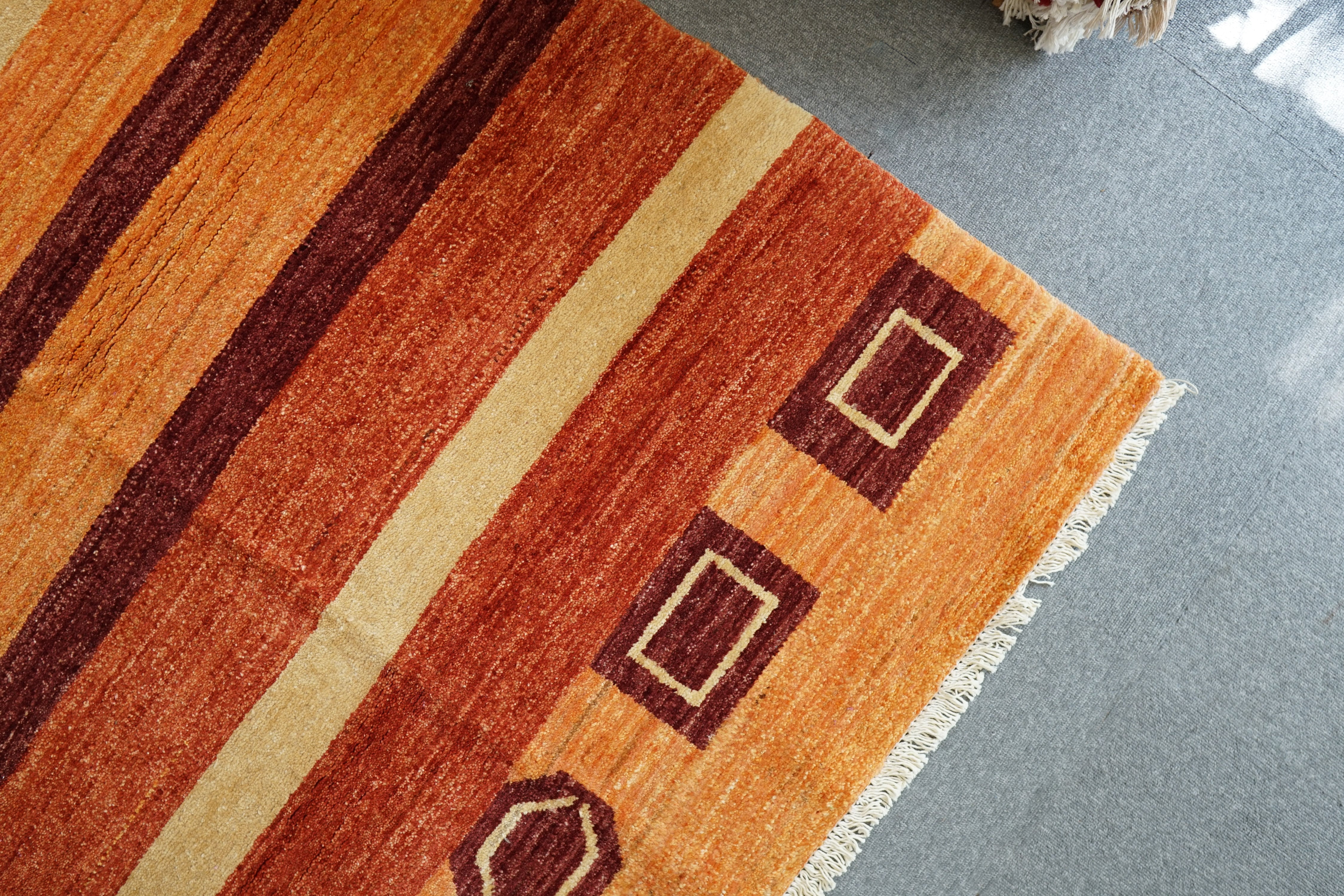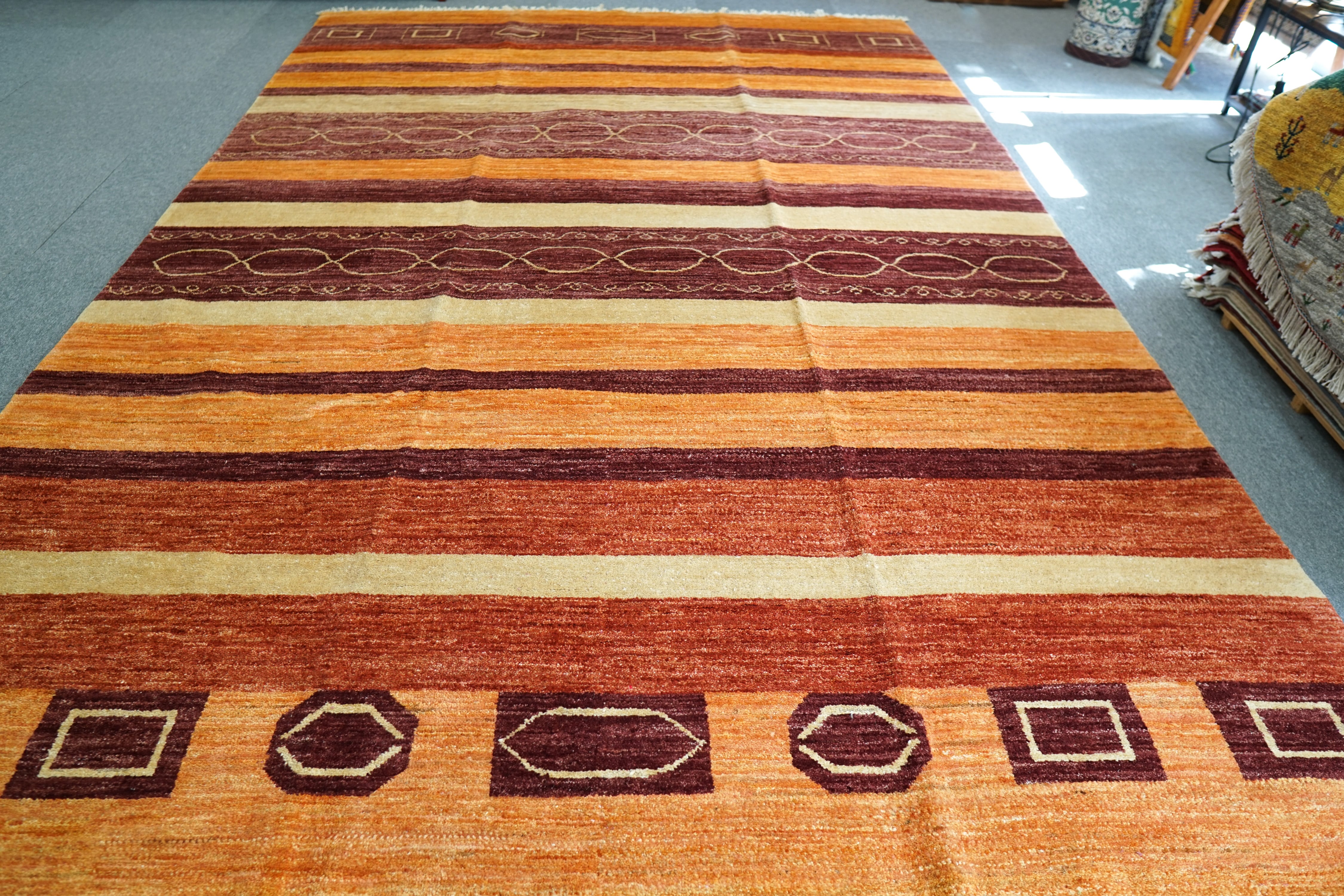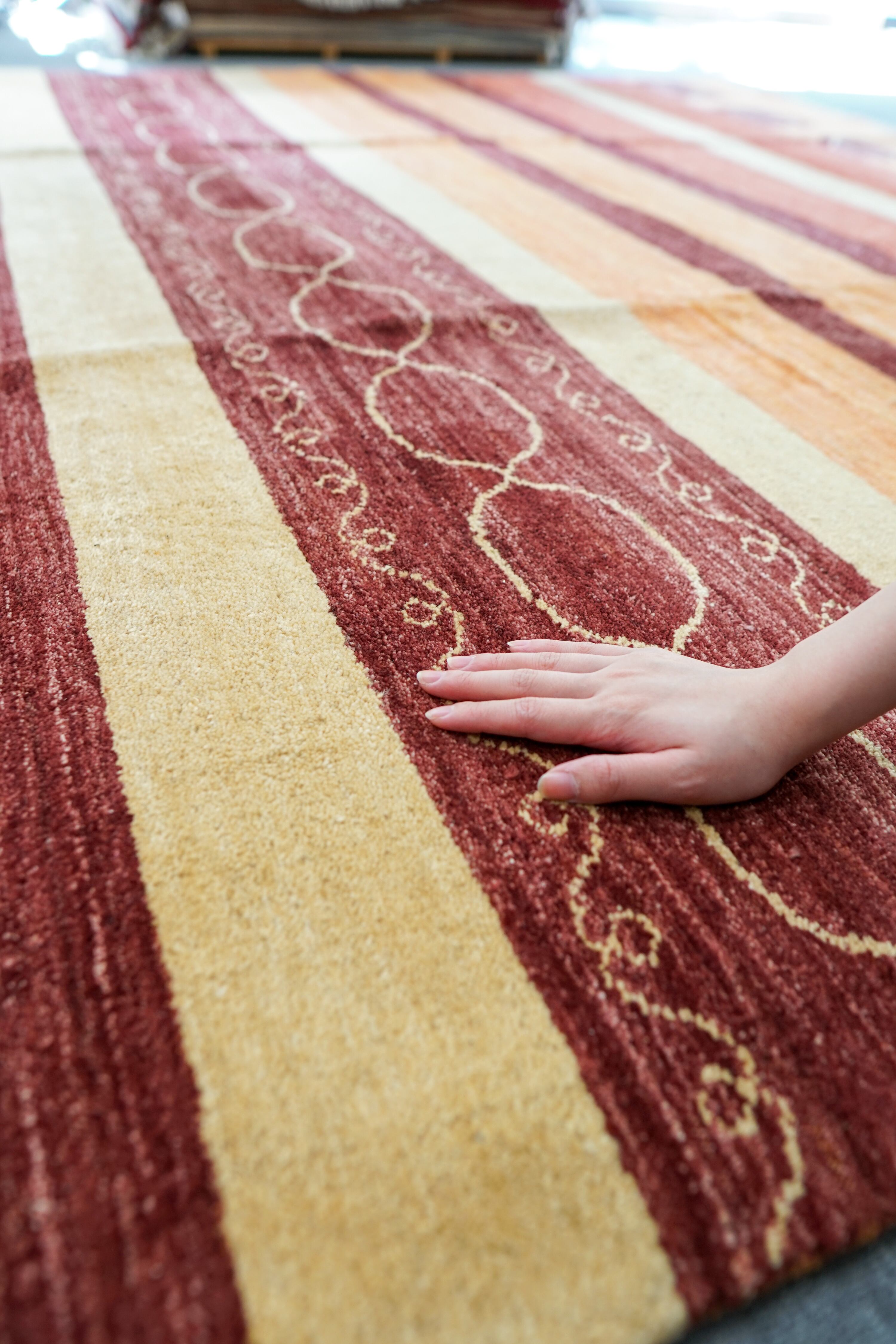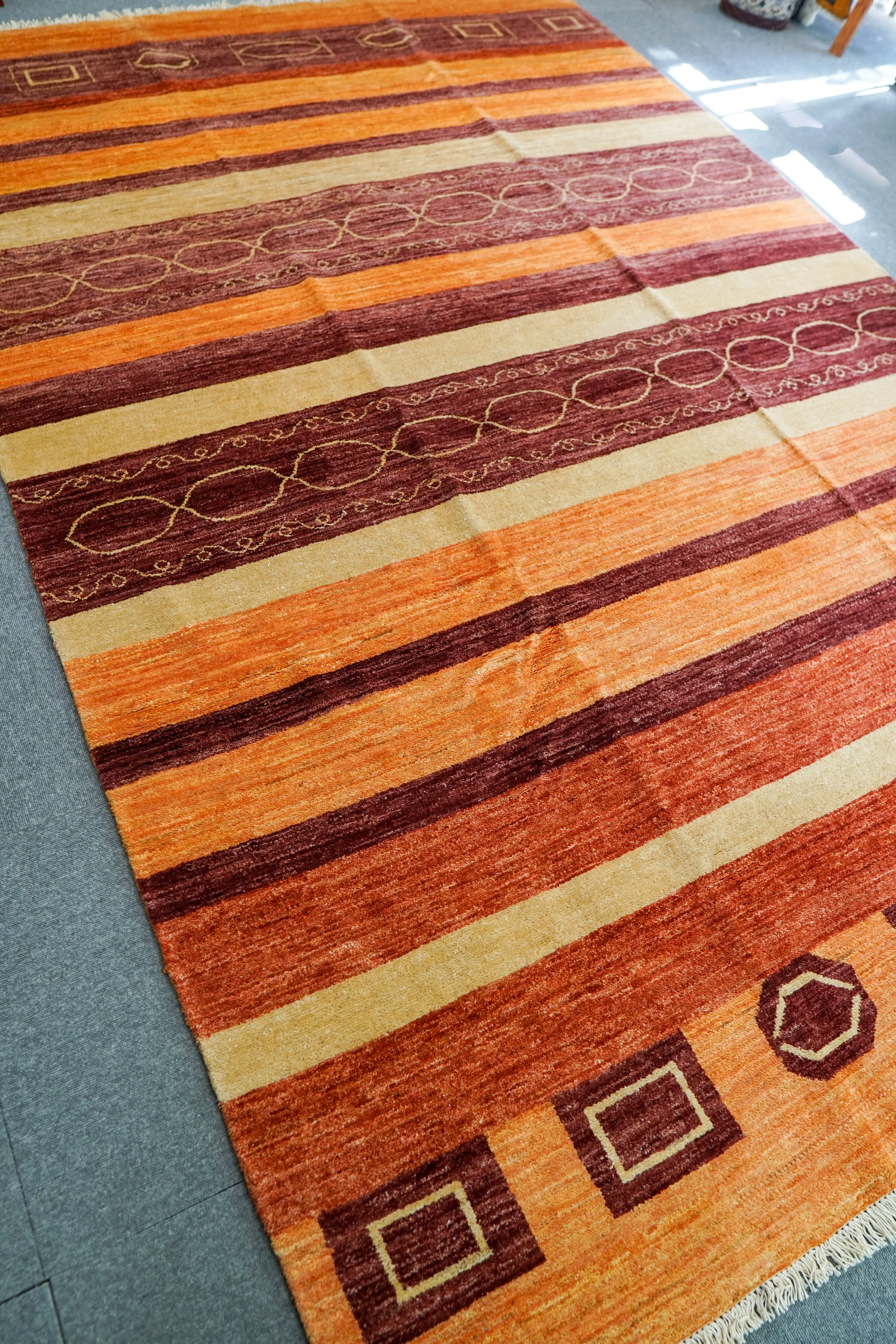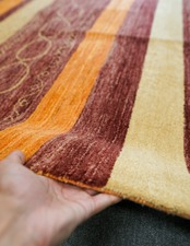 ガズニ・ギャッベは、アフガニスタンのガズニ地方で手織りされるペルシャ絨毯の一種です。鮮やかな色彩、部族的なデザイン、そして厚みのある柔らかなパイル(毛足)が特徴で、遊牧民や半遊牧民によって作られる伝統的な ギャッベ絨毯のバリエーションです。