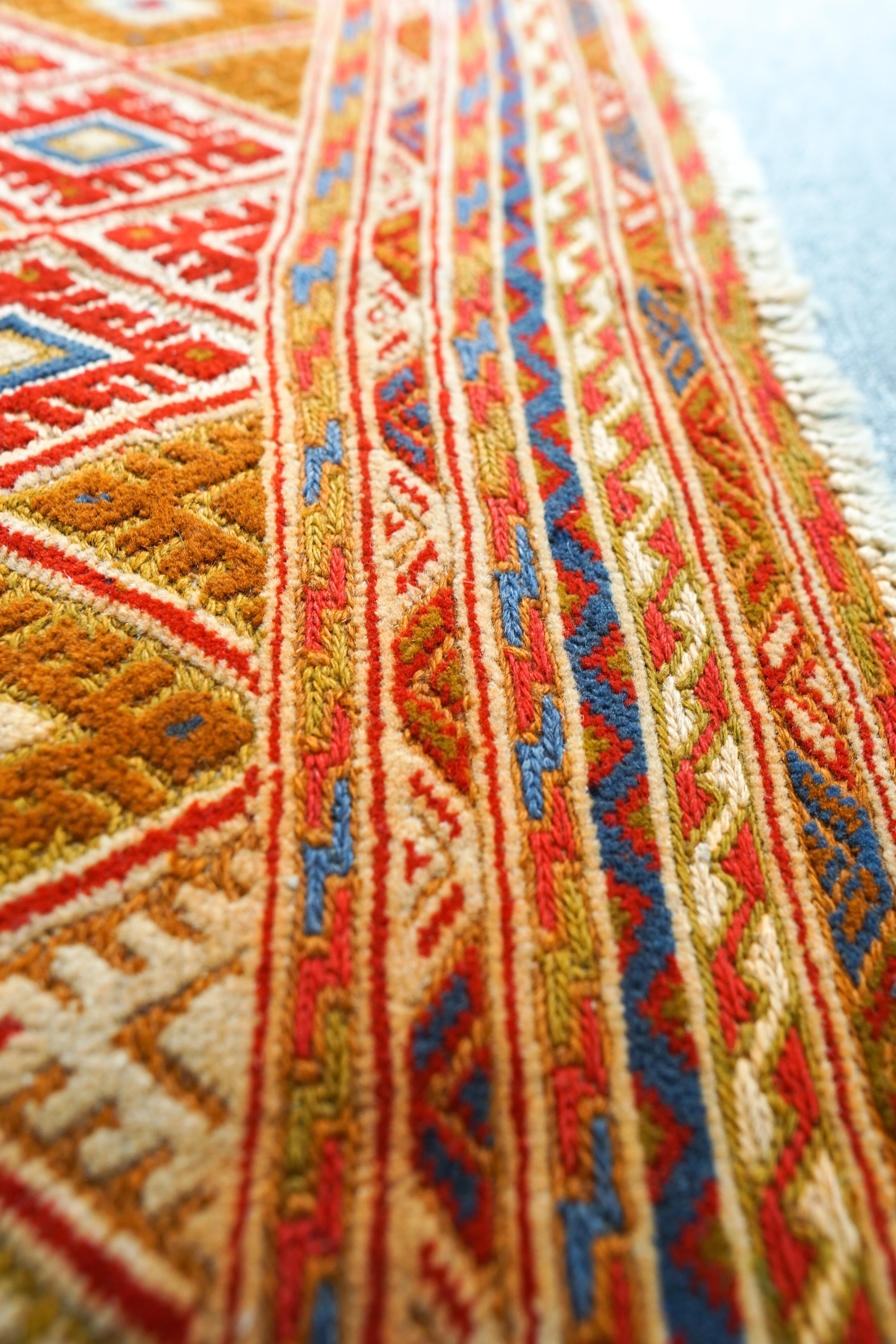 毛足のない麻のような肌触りのキリムと、パイル地の絨毯部分を合わせもった凸凹のある絨毯で、幾何学的なデザインが美しく、踏み心地も大変良いです。