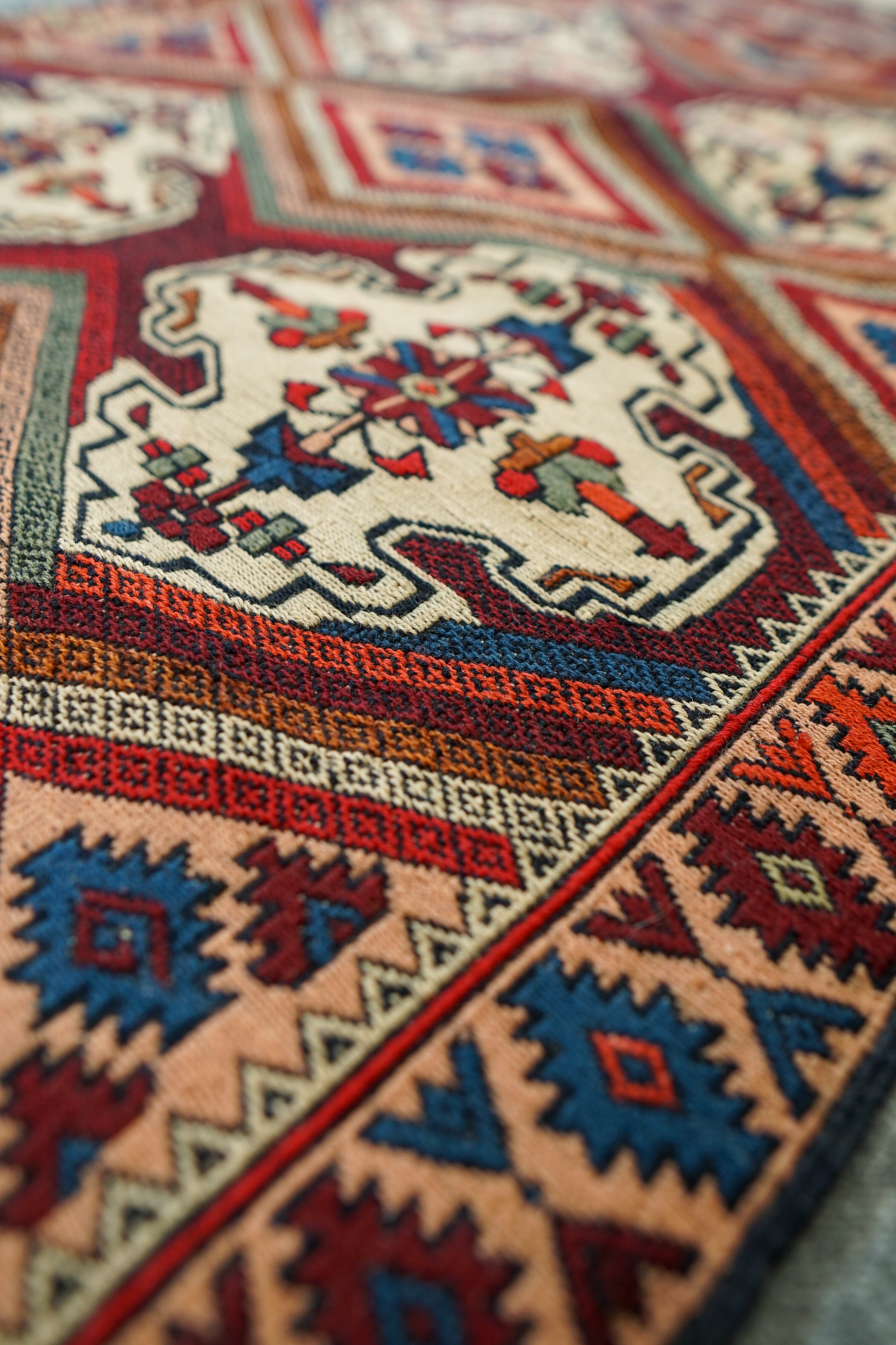 草木染め総手織りのスザニキリム。ウールを紡ぐ段階から手仕事でつくられています。防汚性や通気性に優れ、丈夫で美しい高品質な薄手の絨毯です。