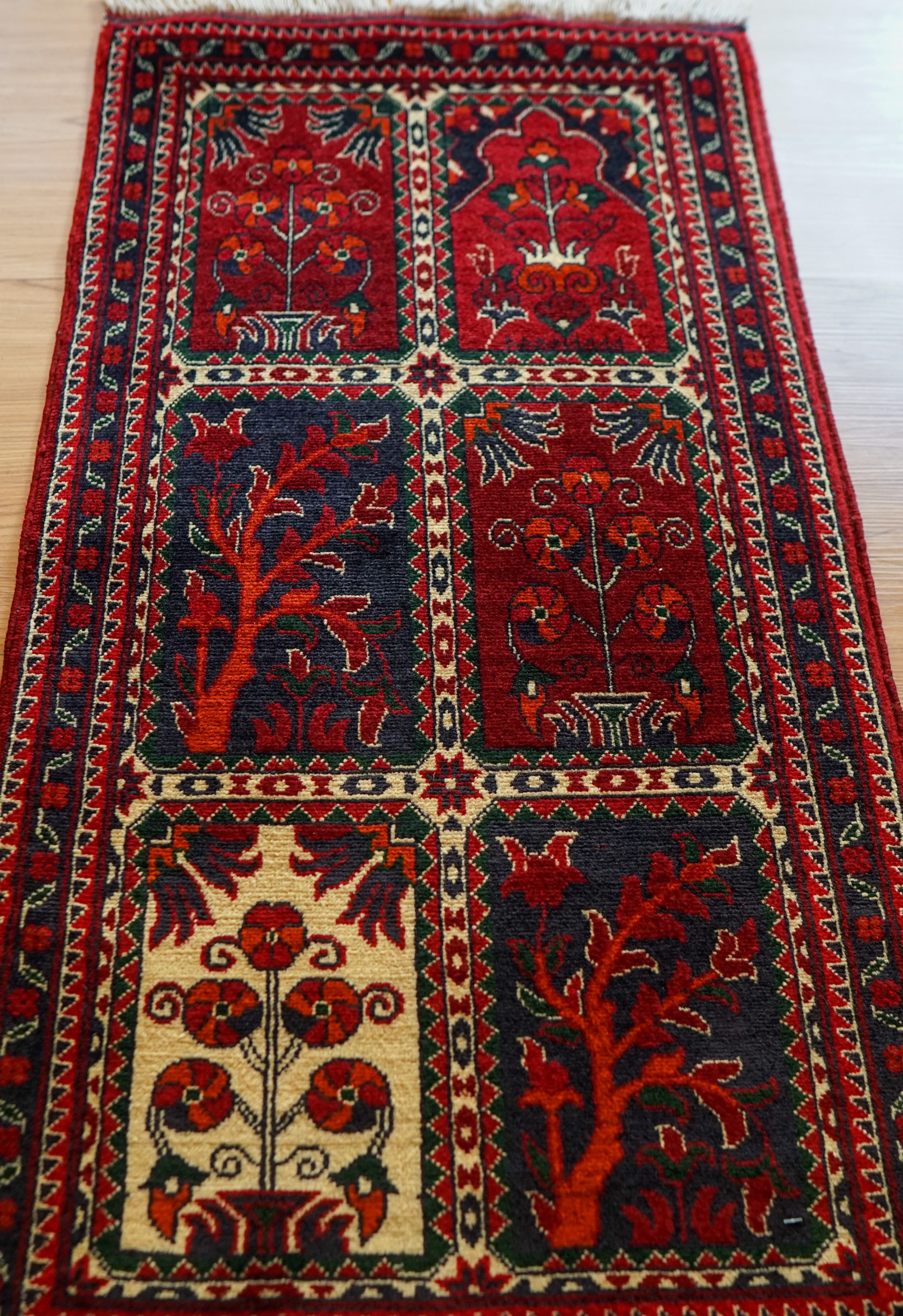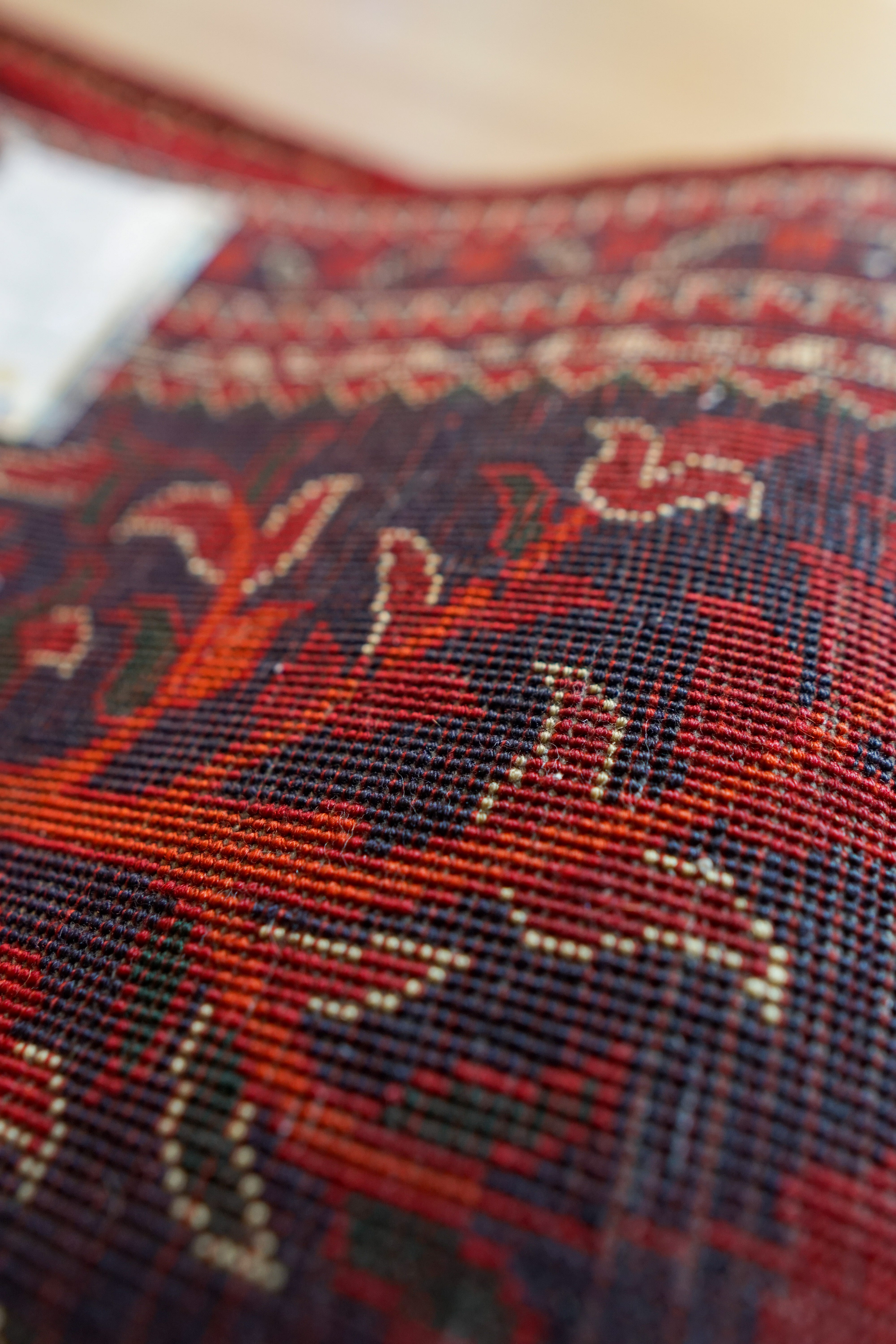 アフガニスタン北西部の伝統あるカールモハメディ工房で丁寧に織り上げられた103×53cmの手織り絨毯。古くから王侯貴族の贈答品として重用された歴史を持つ地域で、天然ソフトウールを使い細密な草花文様を表現。濃赤と藍色のコントラストが美しく、職人の高い技術と感性が息づく一枚です。玄関、ベッドサイド、デスク前などに最適なサイズで、空間に伝統工芸ならではの深みと温かさを添えます。実用性に優れた高品質アフガニスタン手織り絨毯として長く愛用いただけます。