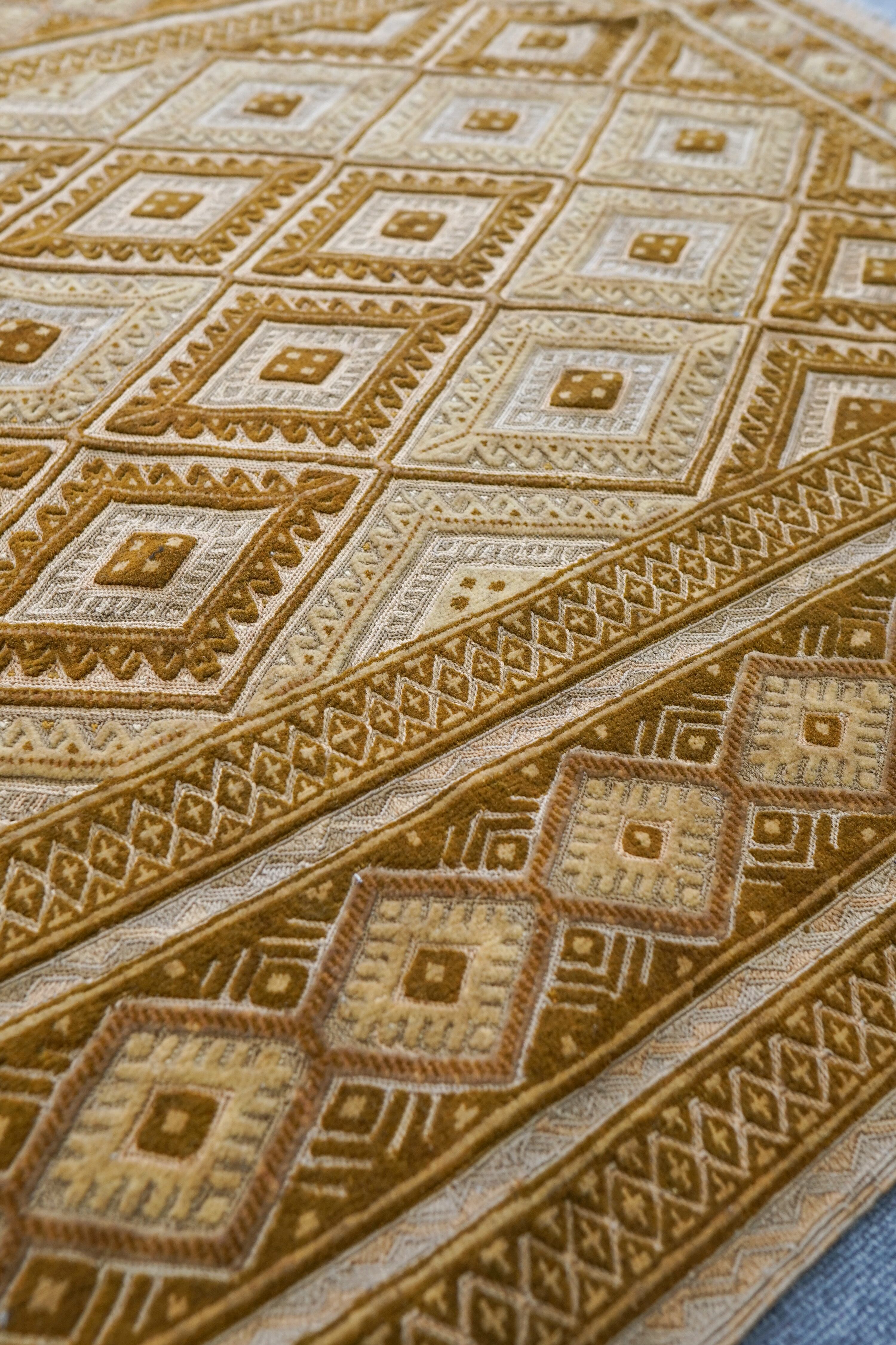 毛足のない麻のような肌触りのキリムと、パイル地の絨毯部分を合わせもった凸凹のある絨毯で、幾何学的なデザインが美しく、踏み心地も大変良いです。