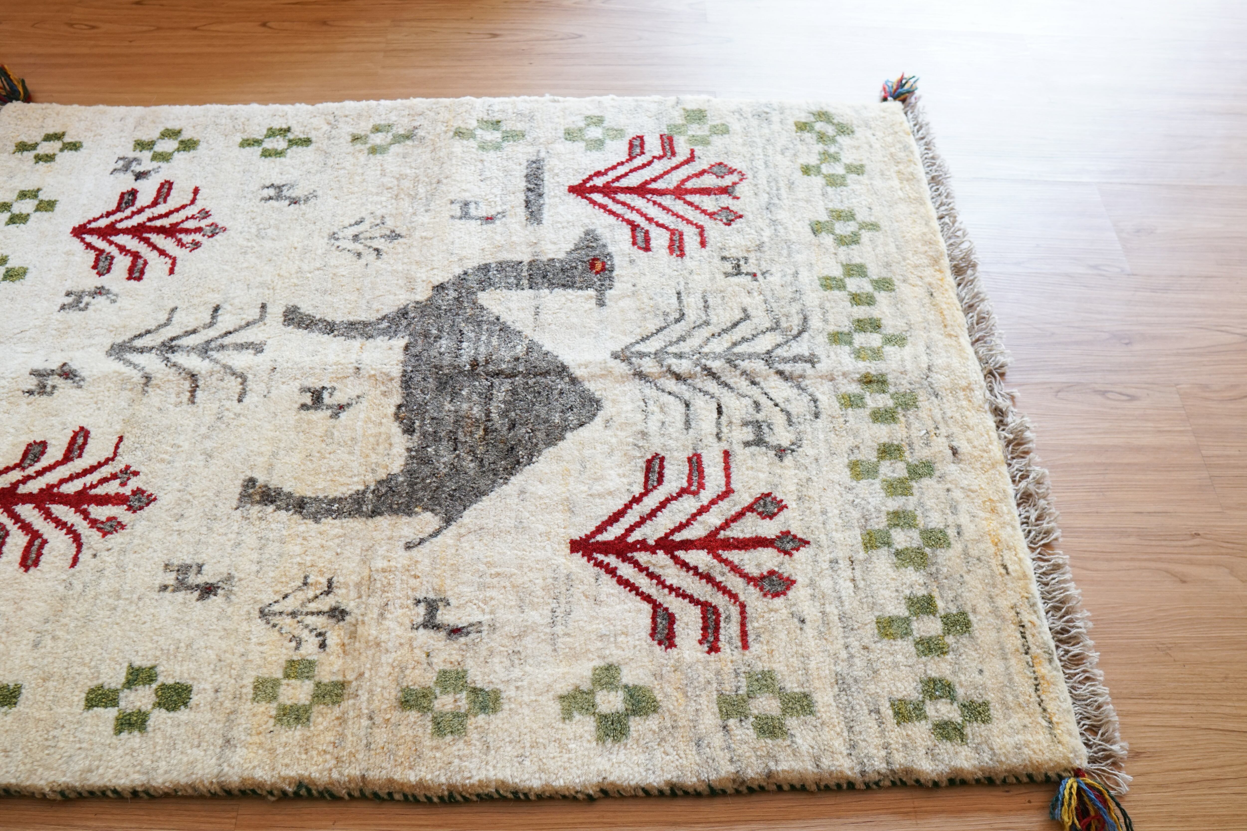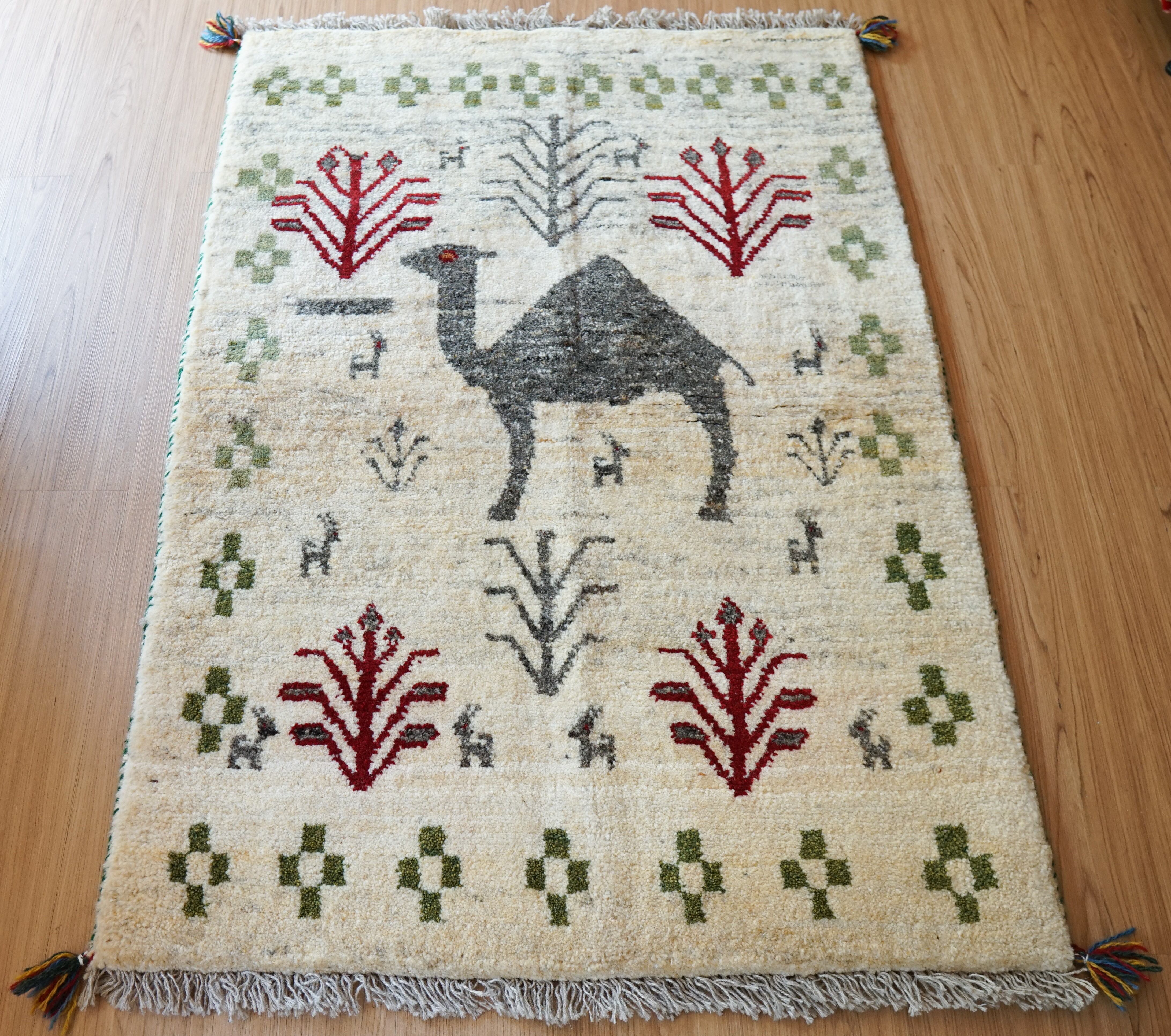 イランの遊牧民カシュガイ族が手織りする、草木染の手紡ぎウールを使ったギャッベという絨毯。太めのウールでざっくりと織られていて厚みがあり、素朴で可愛らしい柄・色遣いが特徴です。