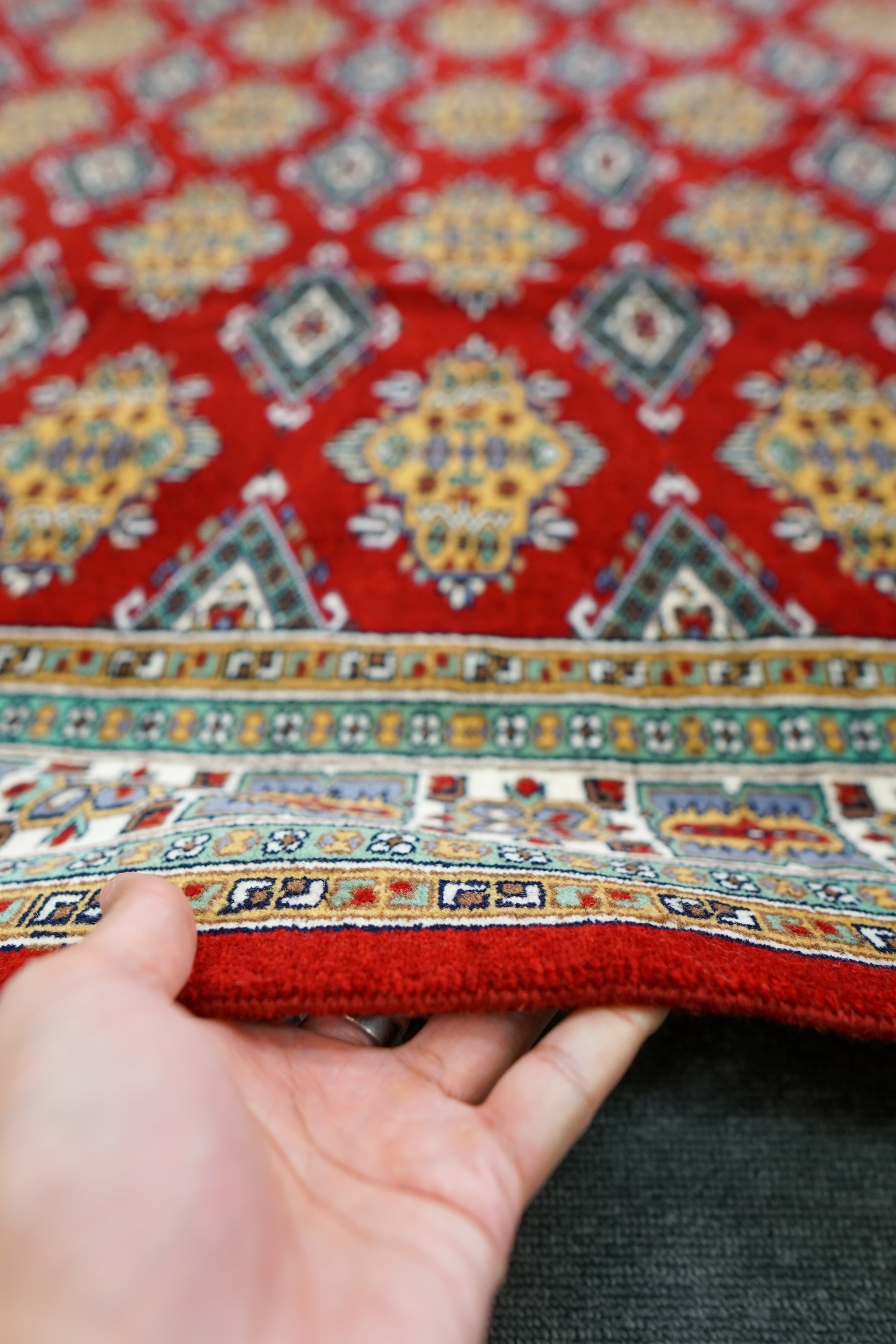 ニュージーランド産の上質なウールに草木染めを施し、パキスタンの職人が何ヶ月もの歳月をかけて手織りした絨毯です。高い織り密度により、しなやかで扱いやすく、細かな柄まで明瞭に織り上げています。表面にはウール特有の上品な艶めきがあり、デザインの美しさを際立たせています。