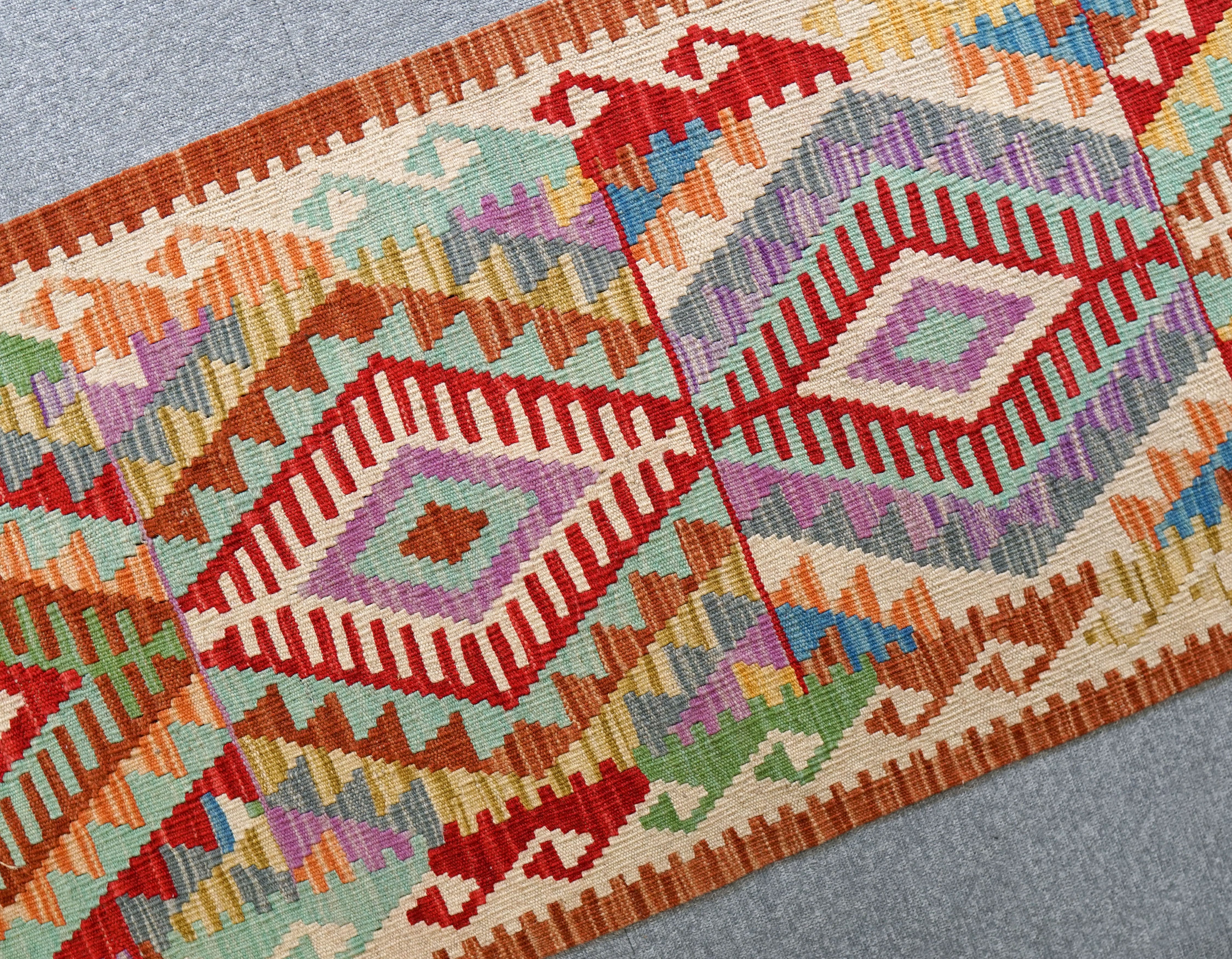 アフガニスタン中央の山間部で生活する遊牧民によって織られたキリム。キリムとは、トルコ、イラン、アフガニスタンを主な産地とする毛足のない平織りのトライバルラグで、汚れれば水洗いをし、破れれば修理をしたり袋物に作り変えたりと現地では大切に使われています。
