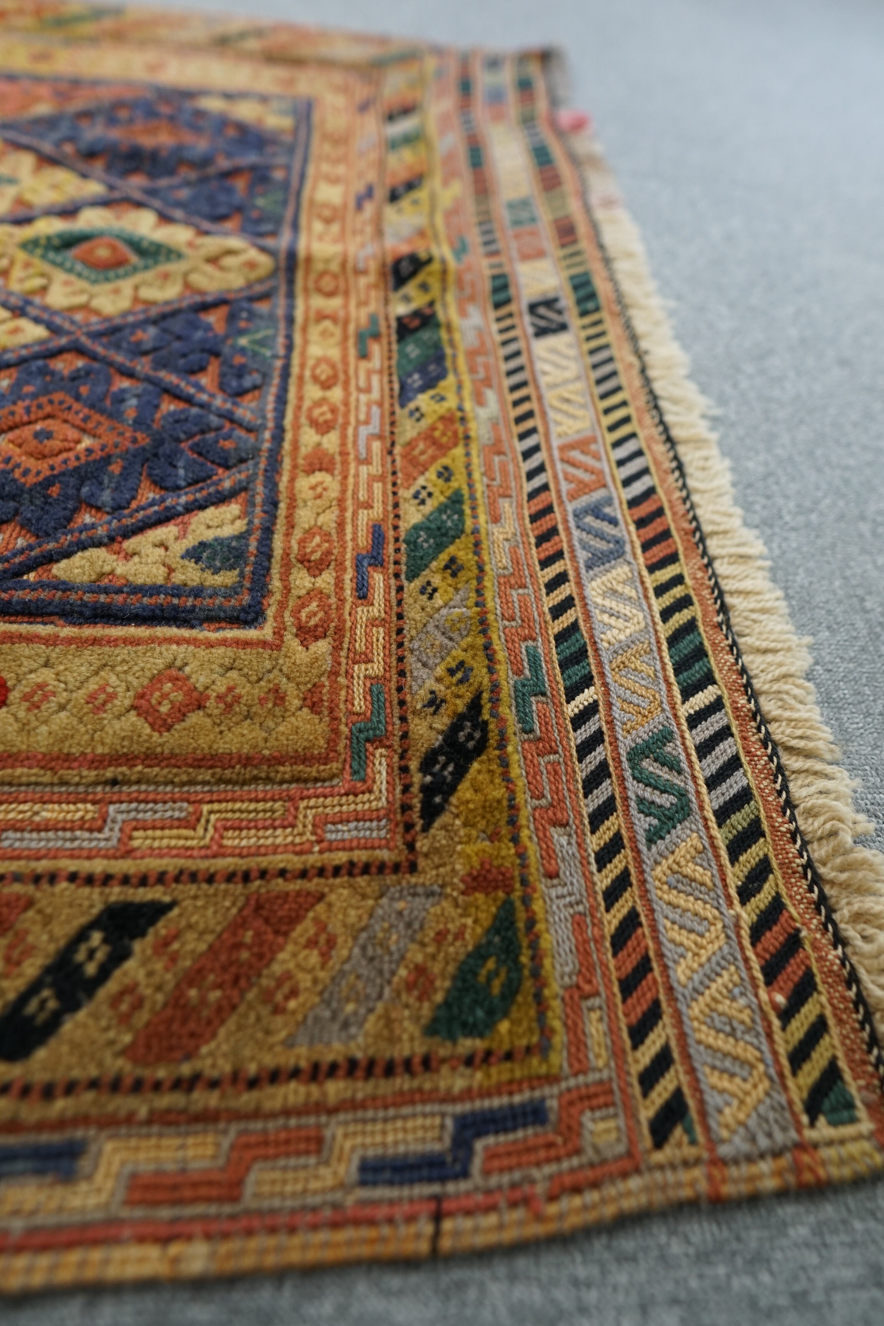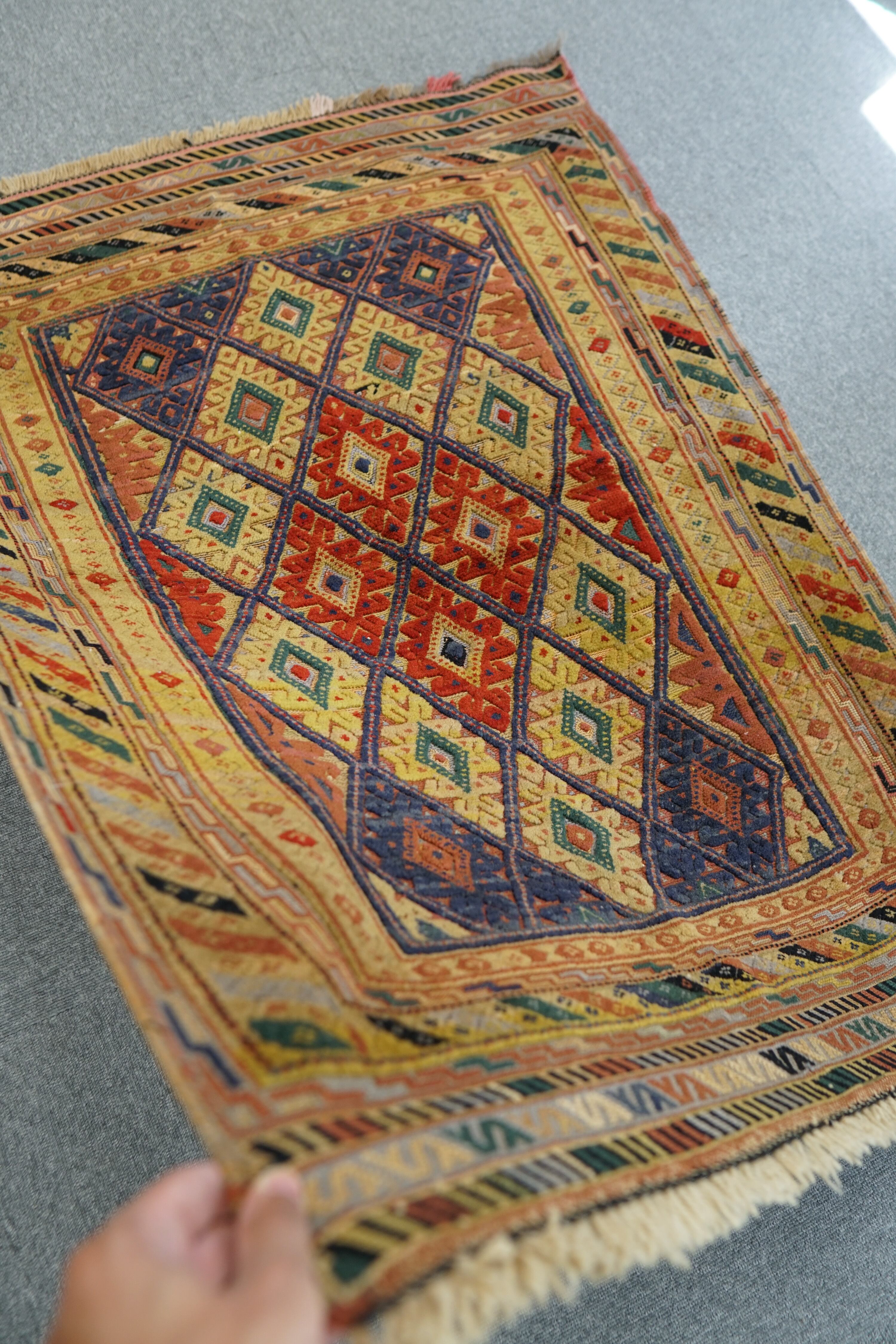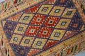 毛足のない麻のような肌触りのキリムと、パイル地の絨毯部分を合わせもった凸凹のある絨毯で、幾何学的なデザインが美しく、踏み心地も大変良いです。