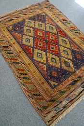 アフガニスタン ヘラート産のマシュワニキリムです。マシュワニ族という部族が手織りしています。彼らの得意とするスマック織りという技法は、複雑な織り技術を要するため難易度が高く、希少で日本ではあまり出回っていません。