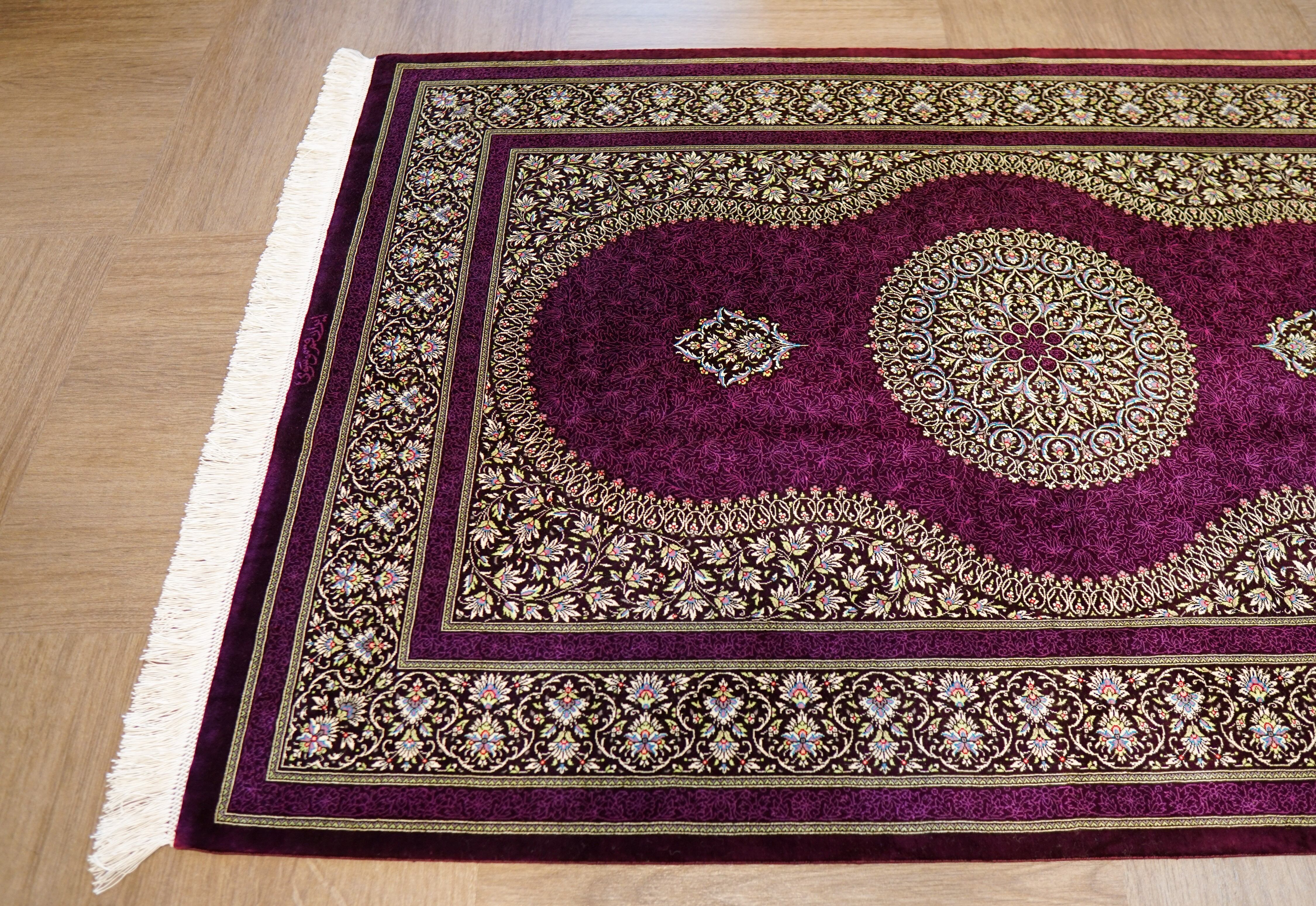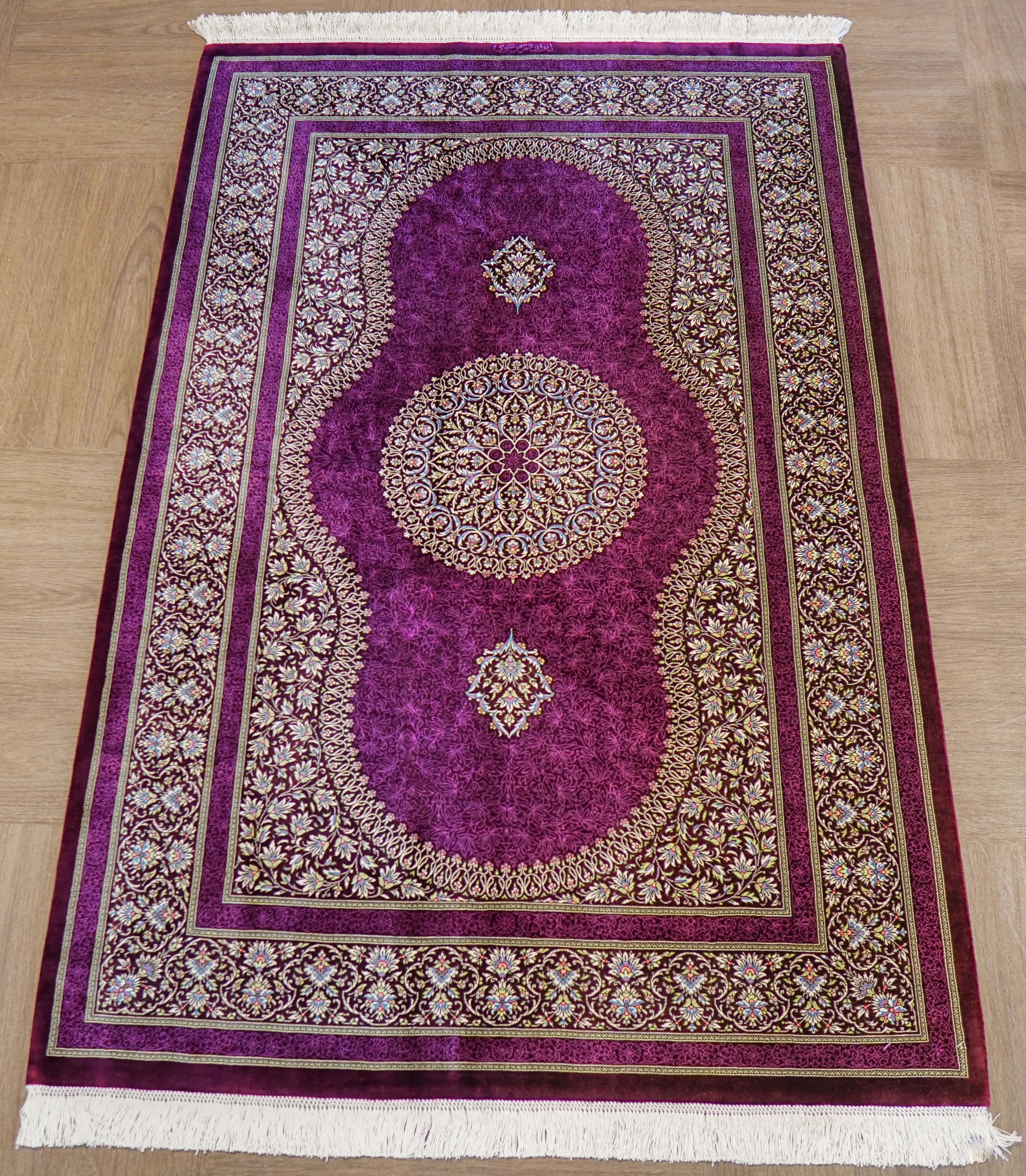 152×100cm 【ペルシャクム産 モサーウィ房 の総手織りシルク絨毯】証明書付