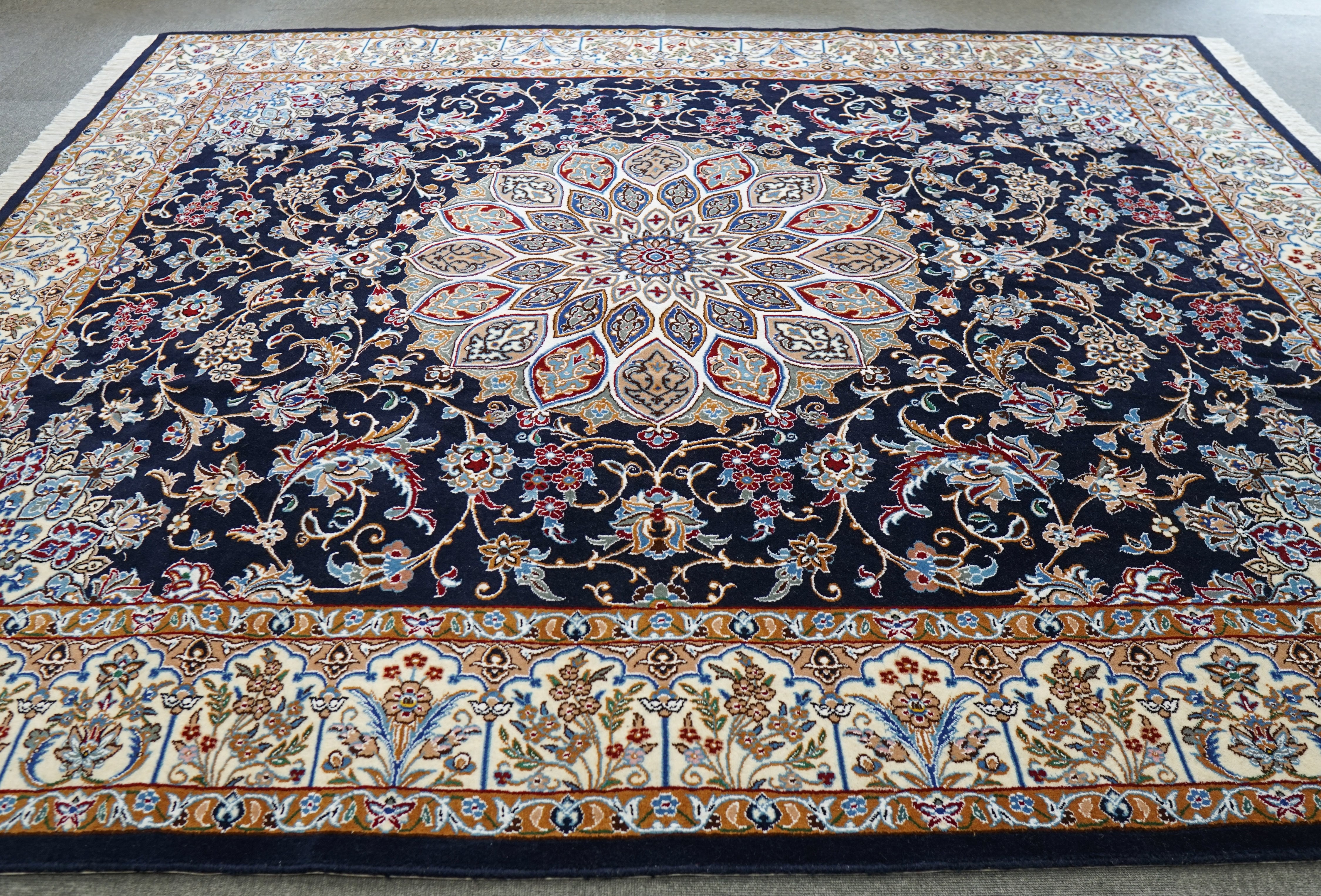 ペルシャ ナイン産の手織り絨毯。生まれて1年以内の子羊から刈り取った貴重なコールクウールで織り上げた大変柔らかい絨毯です。手織り絨毯の特性でもある、毛流れの向きによって色味が異なって見える面白さも存分に味わえる仕上がりになっています。
