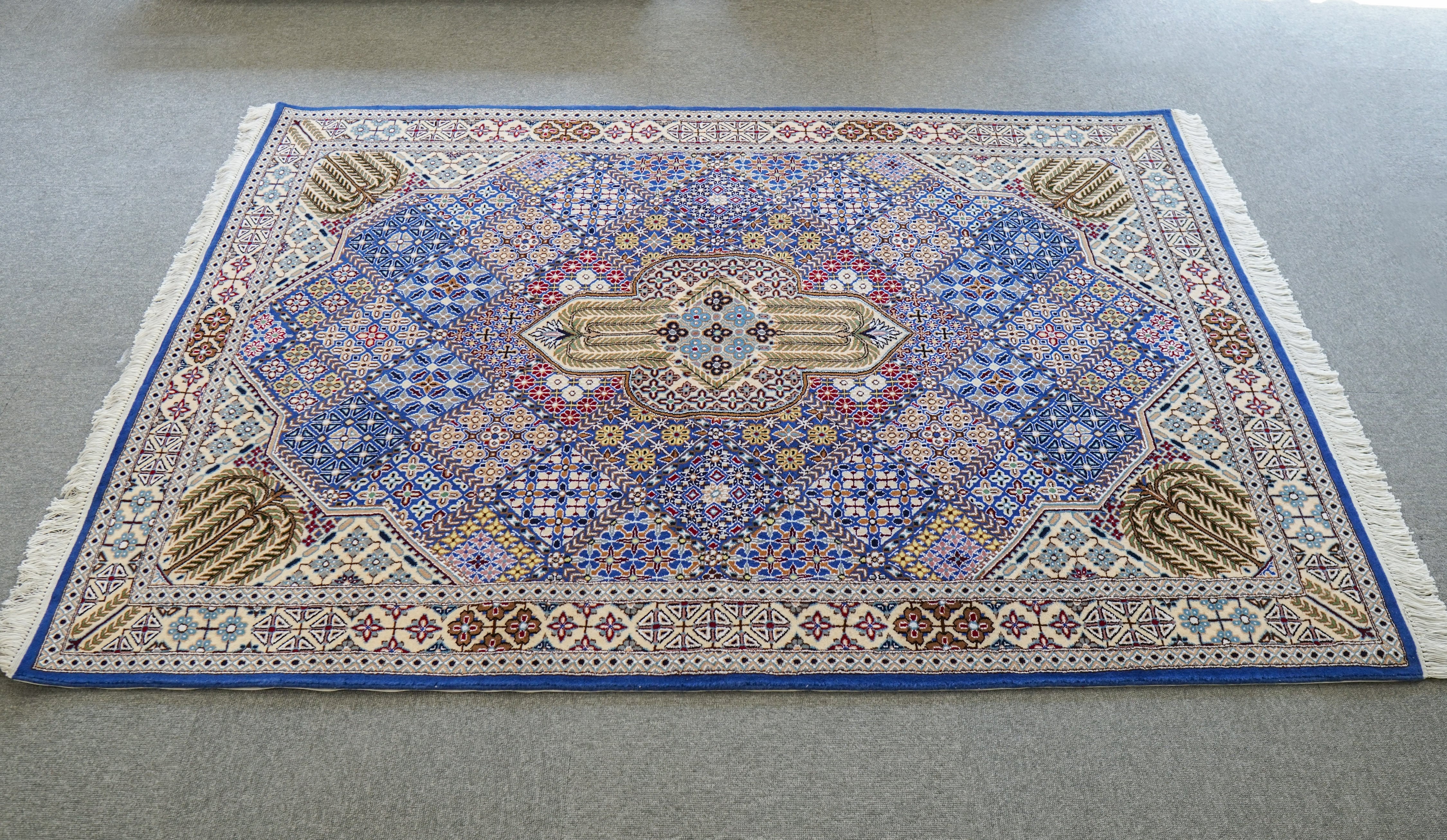 コールクウールという生まれて1年以内の子羊から刈り取った貴重なウールとシルクで織り上げた大変柔らかい絨毯です。しなやかで、大きいサイズですが比較的女性や年配の方でも扱いやすいです。