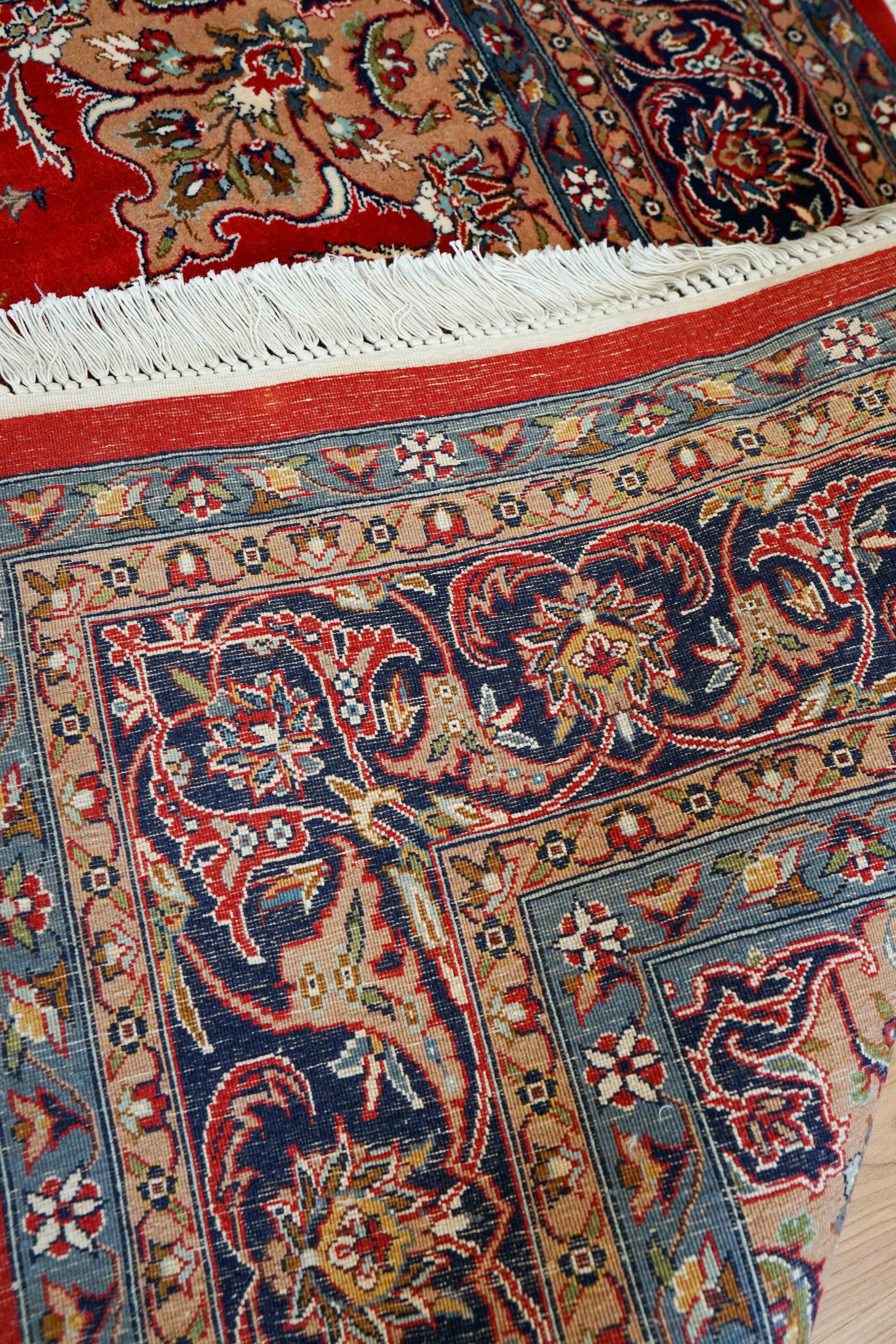 深みのある赤をベースに、繊細な花模様とメダリオンが広がる、伝統的な美しさを感じる手織りペルシャ絨毯です。空間に敷いた瞬間、まるで一枚の絵が広がるような存在感があります。