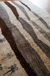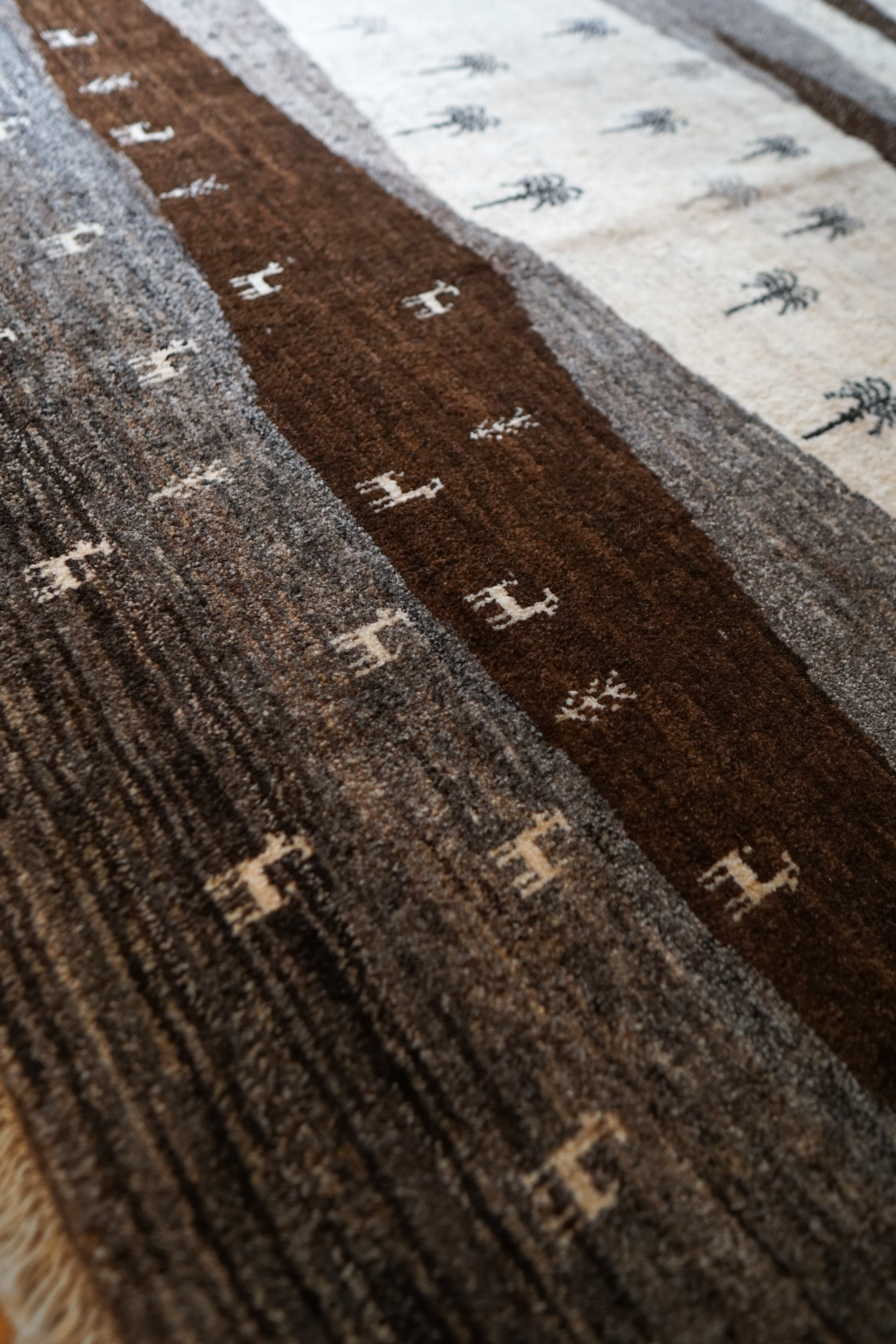 イラン シラーズ地方の遊牧民族が手織りする、草木染の手紡ぎウールを使ったギャッベ。太めのウールでざっくりと織られていて厚みがあり、素朴で可愛らしい柄・色遣いが特徴です。