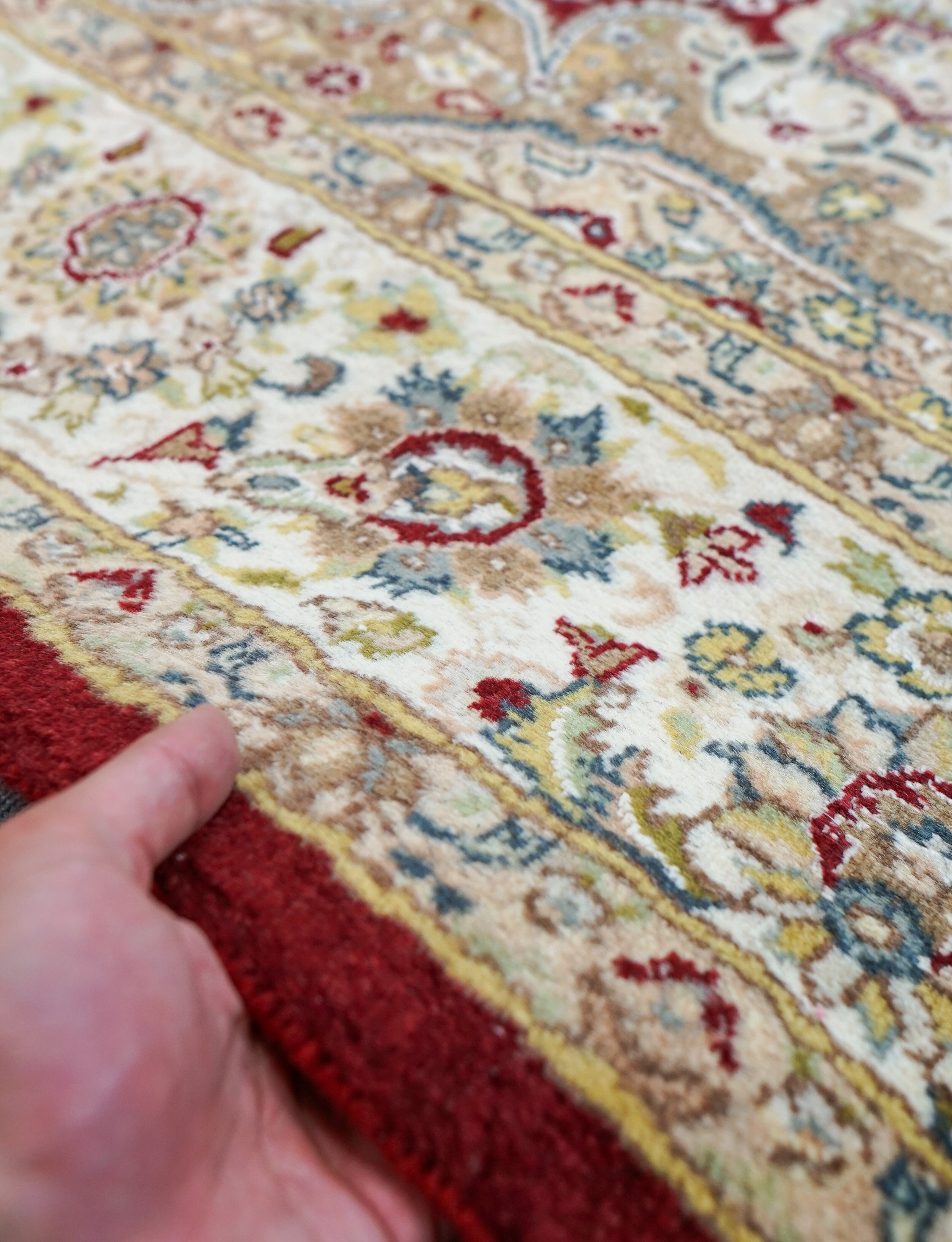 ニュージーランド産の上質なウールを使用し、信頼できる熟練した職人が手織りしたパキスタン絨毯です。ニュージーランド産のウールはタンパク質をたくさん含んでいるためハリ、艶に富むのが特徴です。肌触りはなめらかで柔らかく、弾力のあるパイル地が底冷えを防ぎ足元を快適にします。