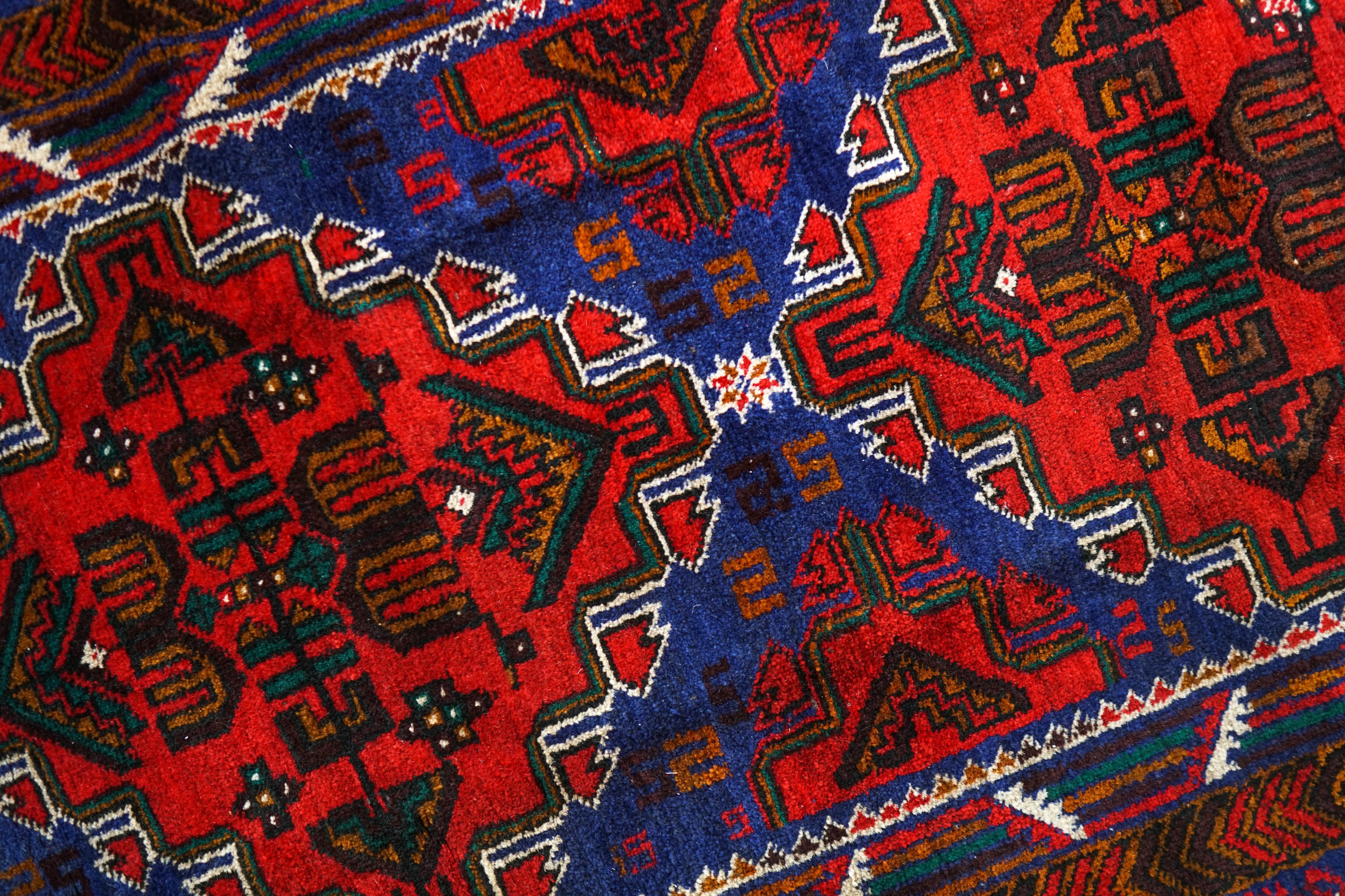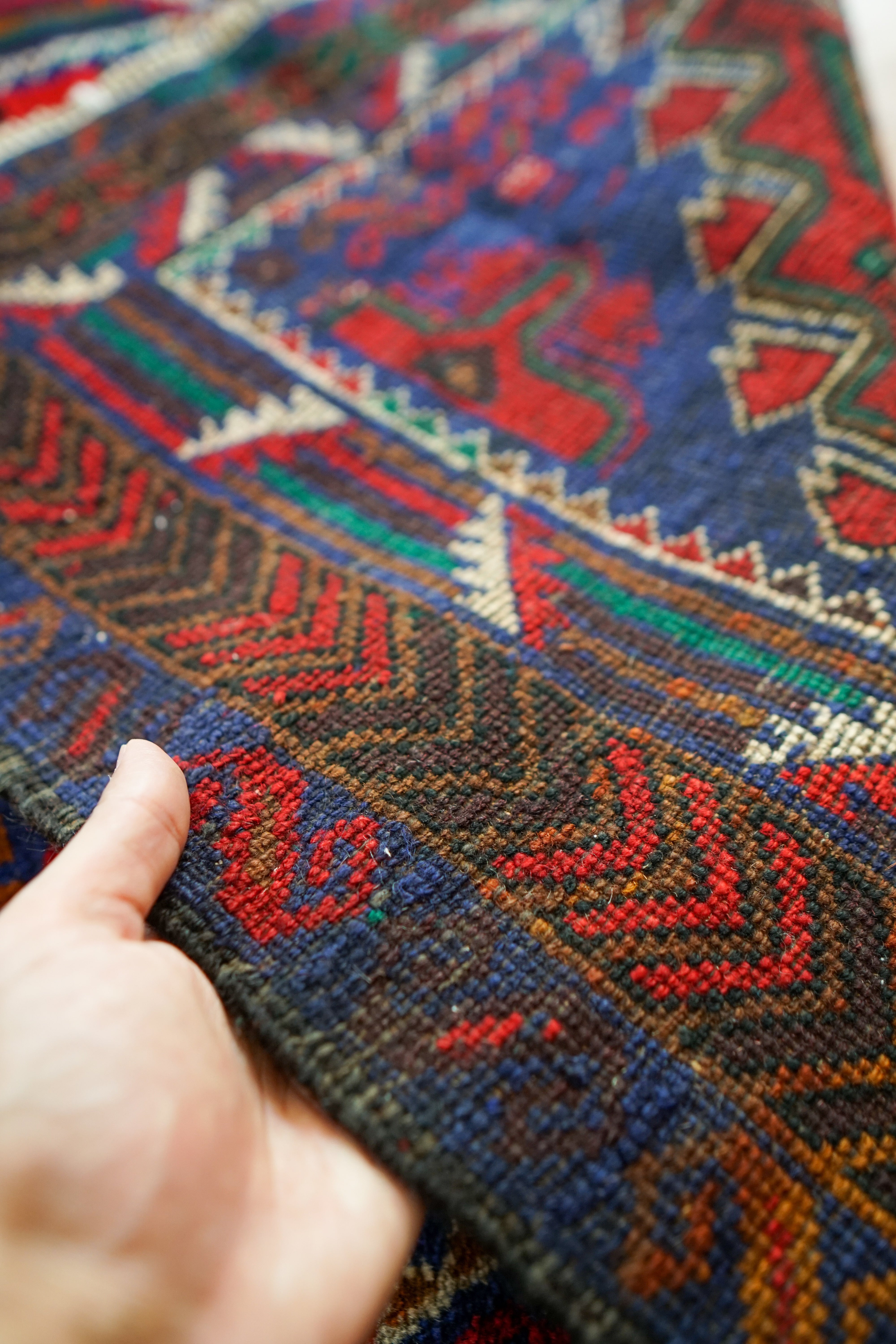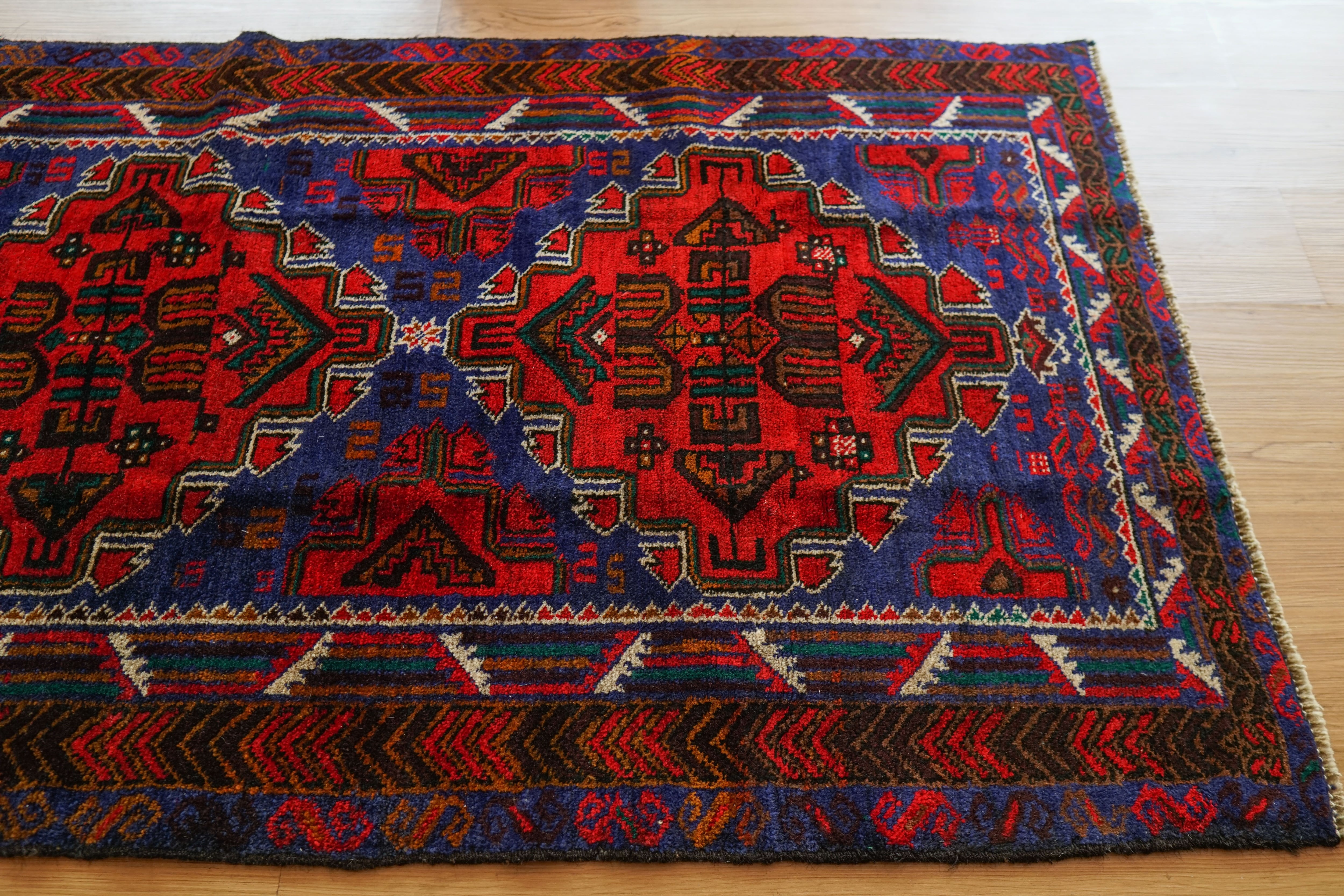 ネイビー×レッドのシンプルな配色に細かいモチーフがたくさん描かれているyaqub khaniの代表的なデザインのバルーチラグ。