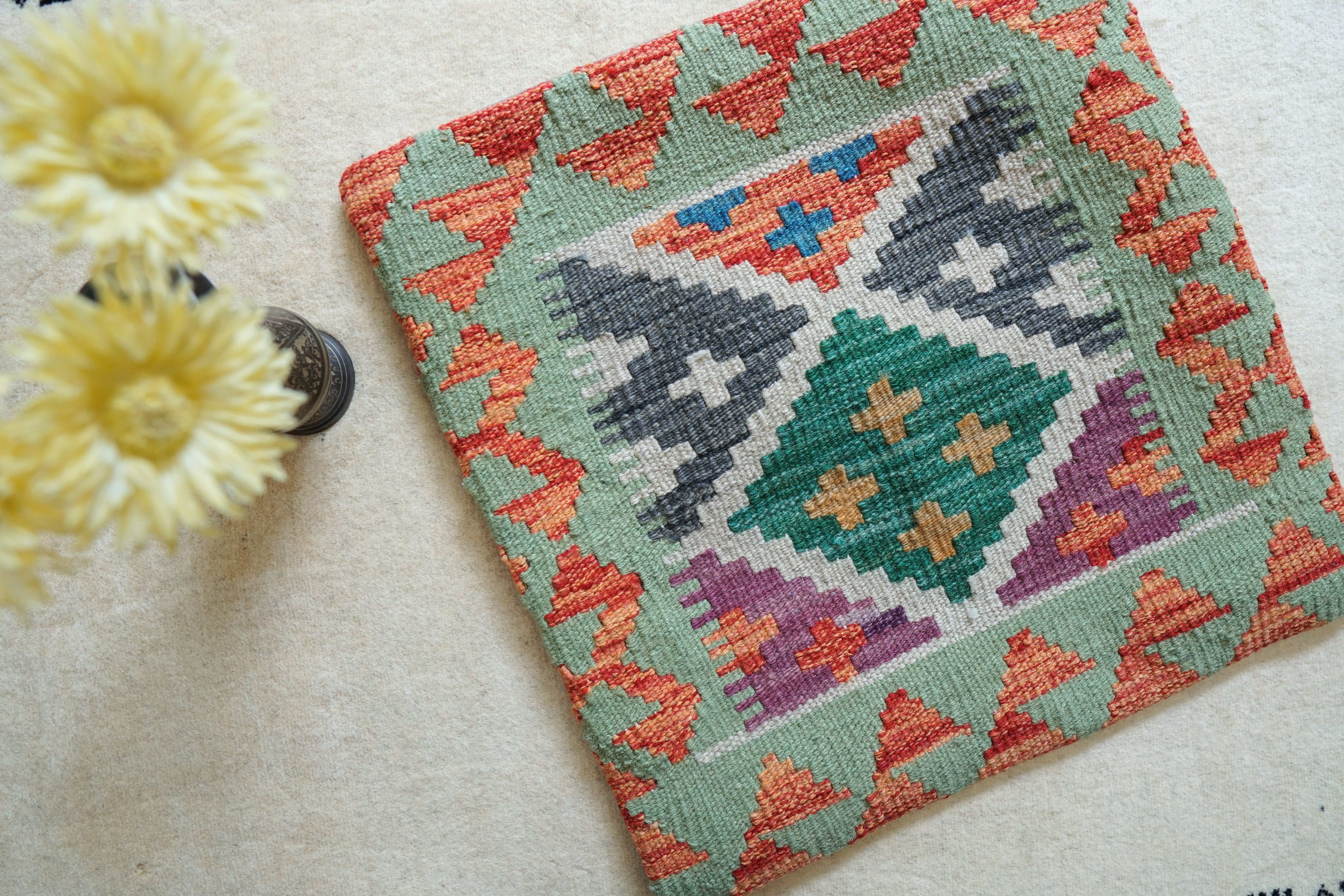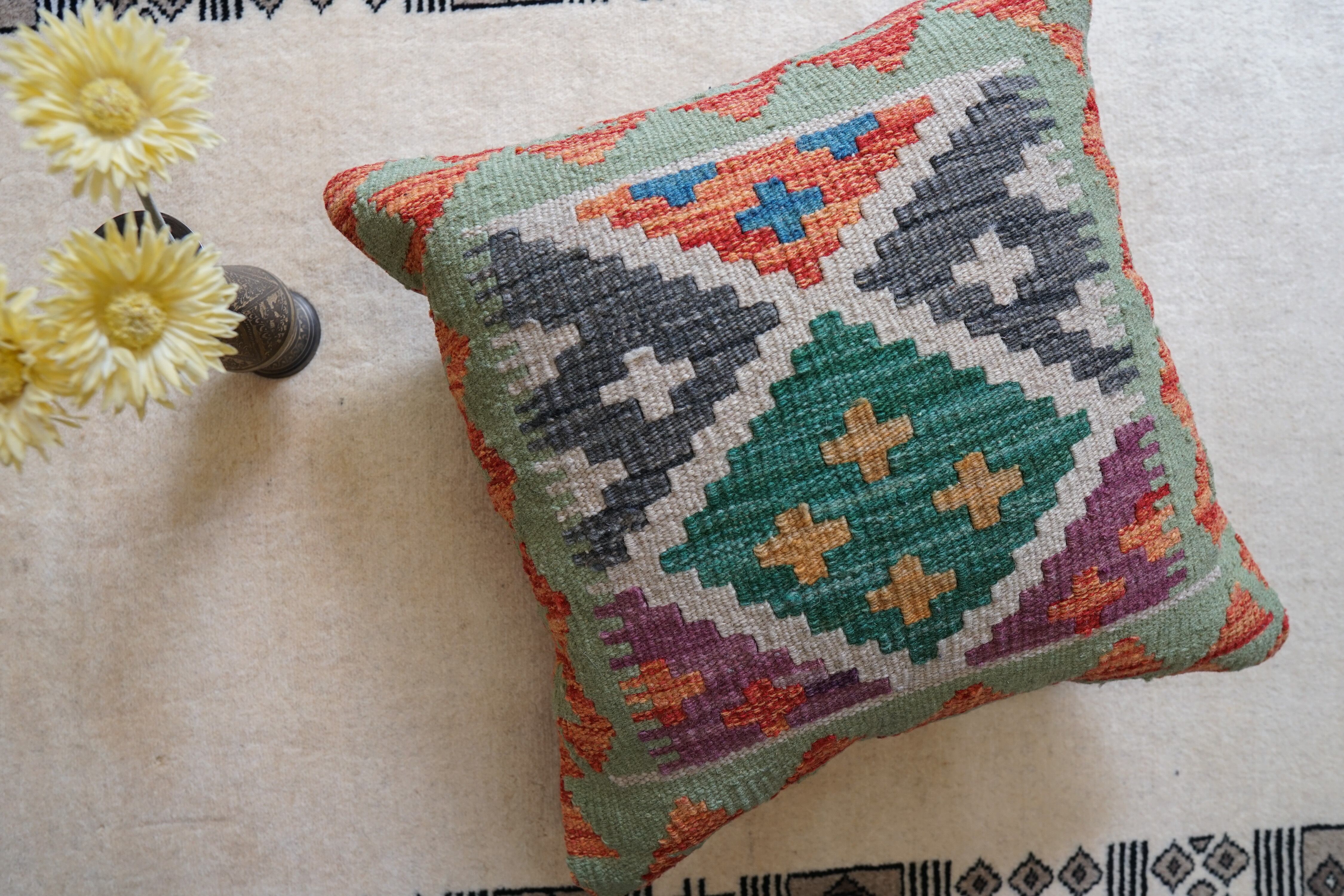 手織りのアフガンキリムを使用したクッションカバー。