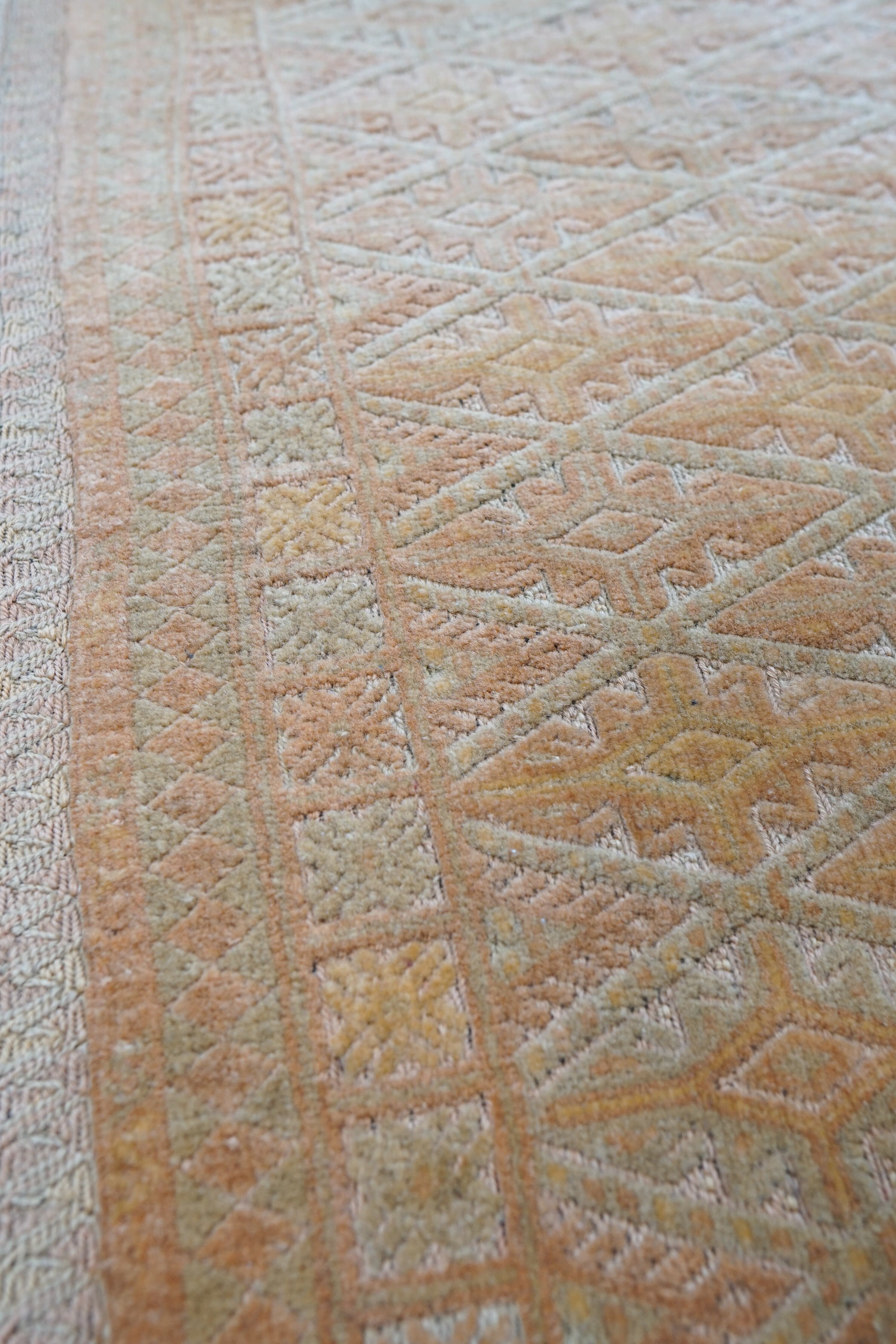 毛足のない麻のような肌触りのキリムと、パイル地の絨毯部分を合わせもった凸凹のある絨毯で、幾何学的なデザインが美しく、踏み心地も大変良いです。