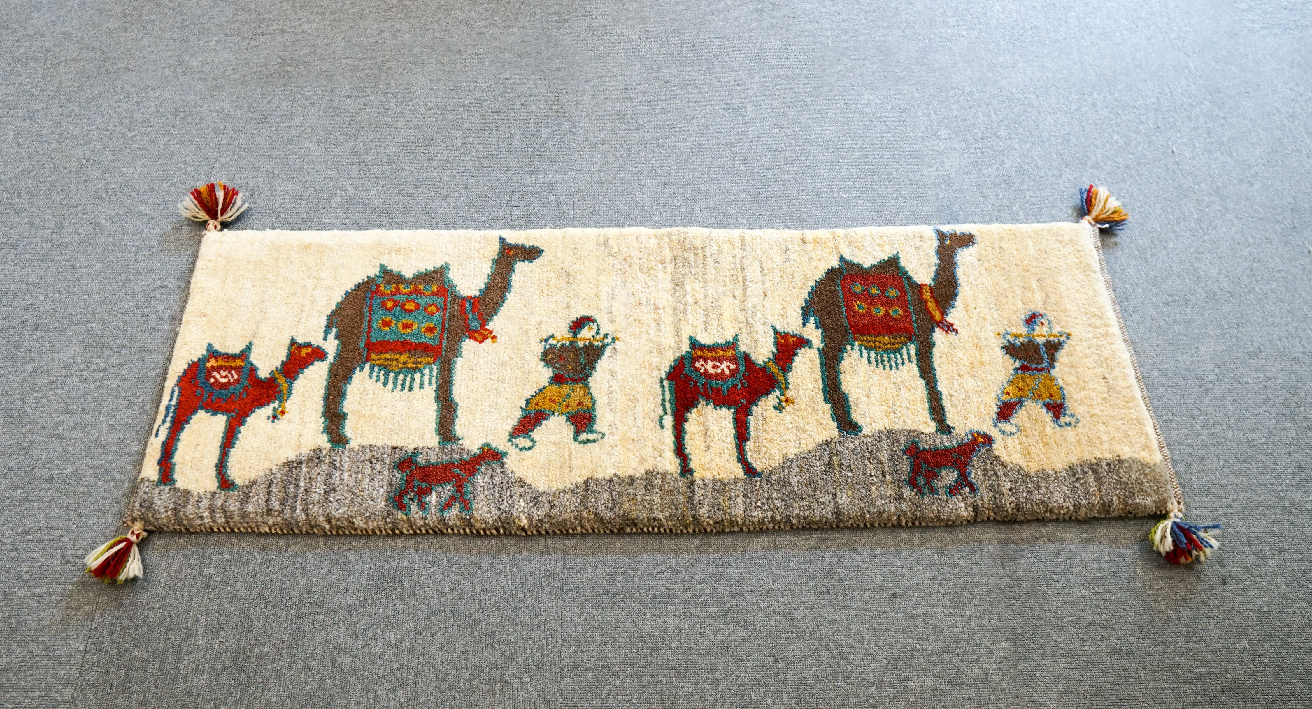イランの遊牧民カシュガイ族が手織りする、草木染の手紡ぎウールを使ったギャッベという絨毯。太めのウールでざっくりと織られていて厚みがあり、素朴で可愛らしい柄・色遣いが特徴です。