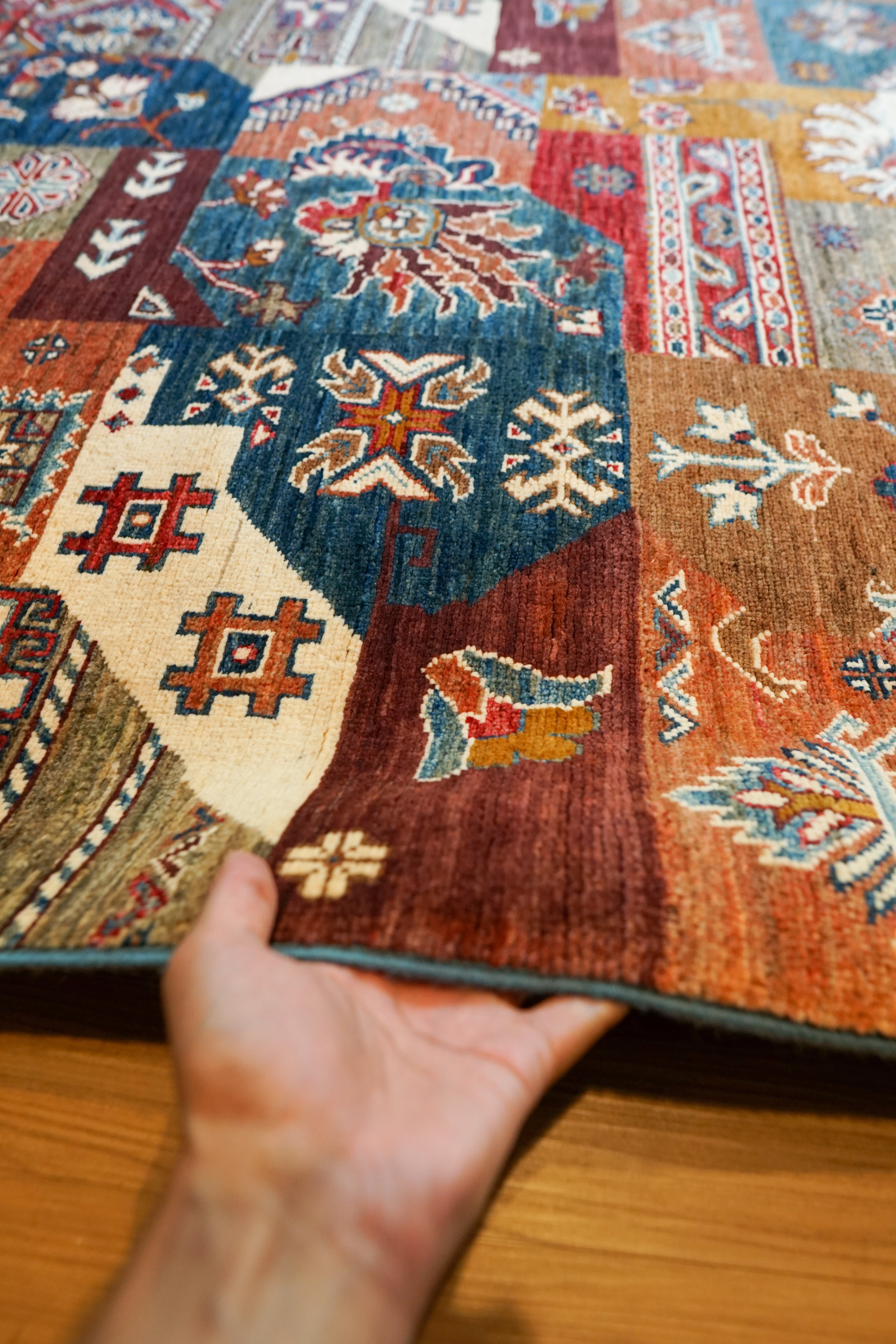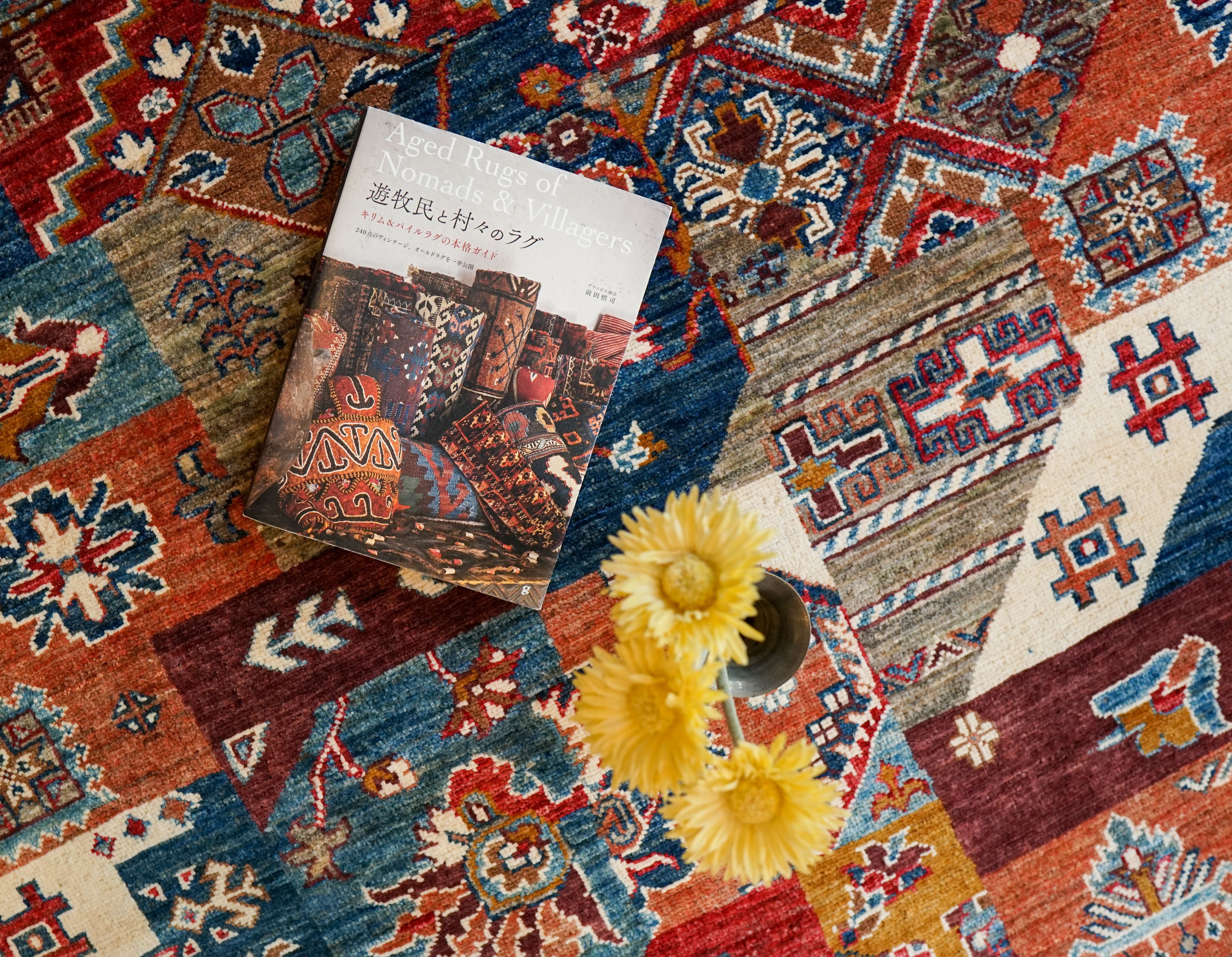 こちらは、206×153cmのアフガニスタン製手織り絨毯。希少で高品質なガズニーウールを贅沢に使用し、柔らかく耐久性のある仕上がりが魅力です。鮮やかなターコイズブルーやレンガレッド、マスタードイエローなど多彩な色彩を組み合わせたパッチワーク風トライバルデザインが特徴。熟練職人による細密な織りで、一枚ごとに異なる表情を持ちます。リビングやダイニングに華やかさを添え、モダンからエスニックまで幅広いインテリアに調和。長く愛用できる一生もののラグです。