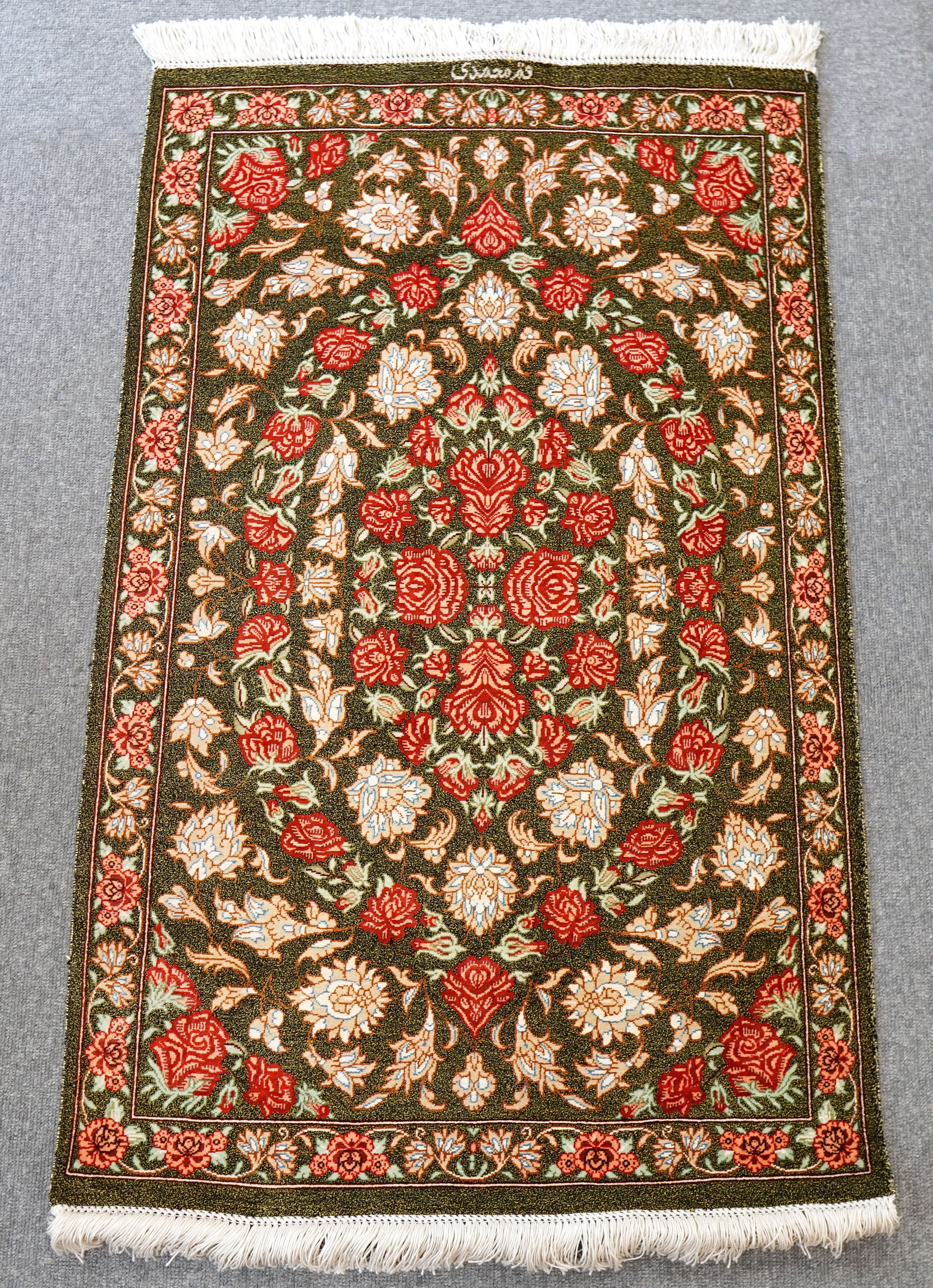 92×57cm 【ペルシャ手織りクム産のシルク100%絨毯】証明書付