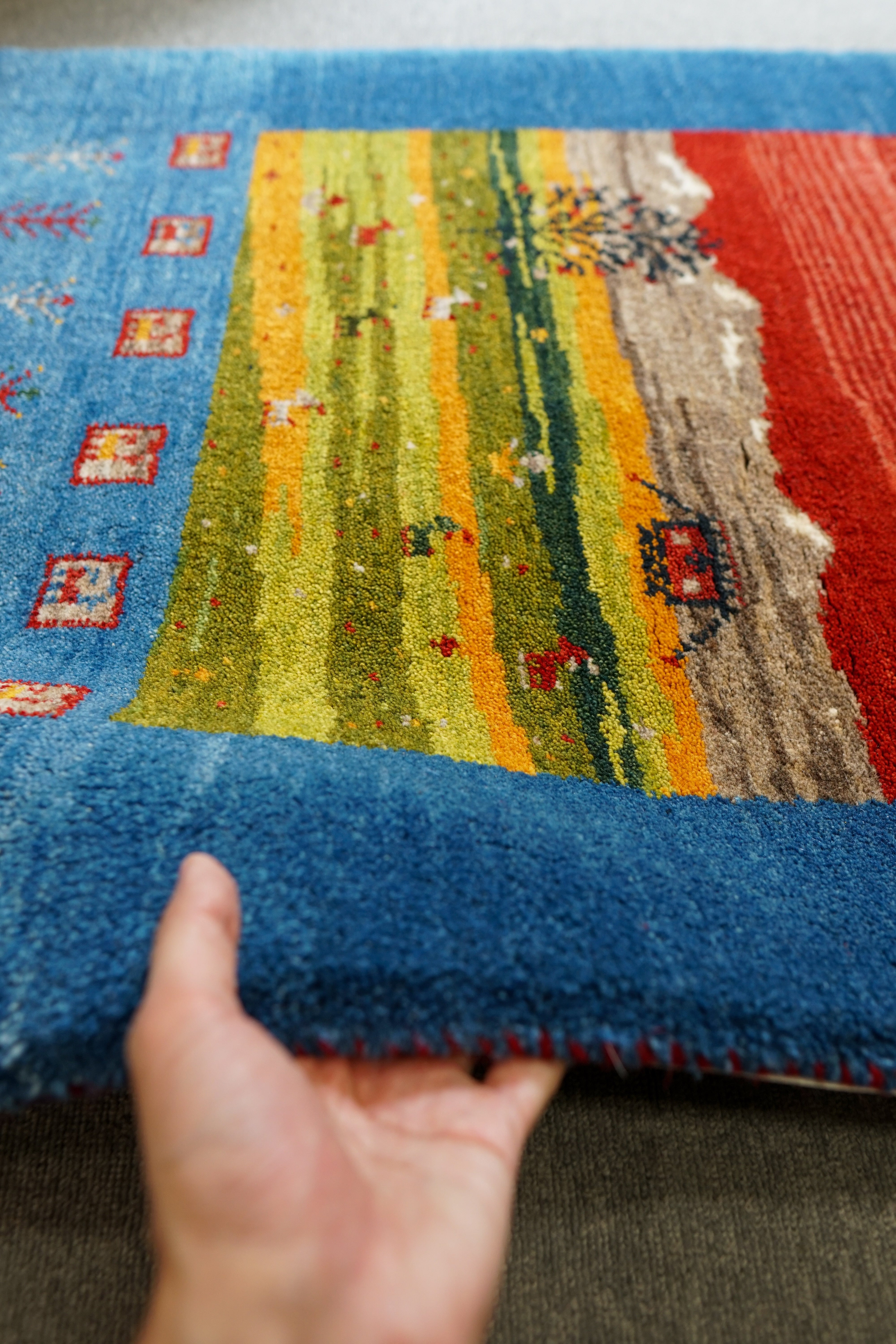 イランの遊牧民カシュガイ族が手織りする、草木染の手紡ぎウールを使ったギャッベという絨毯。太めのウールでざっくりと織られていて厚みがあり、素朴で可愛らしい柄・色遣いが特徴です。
