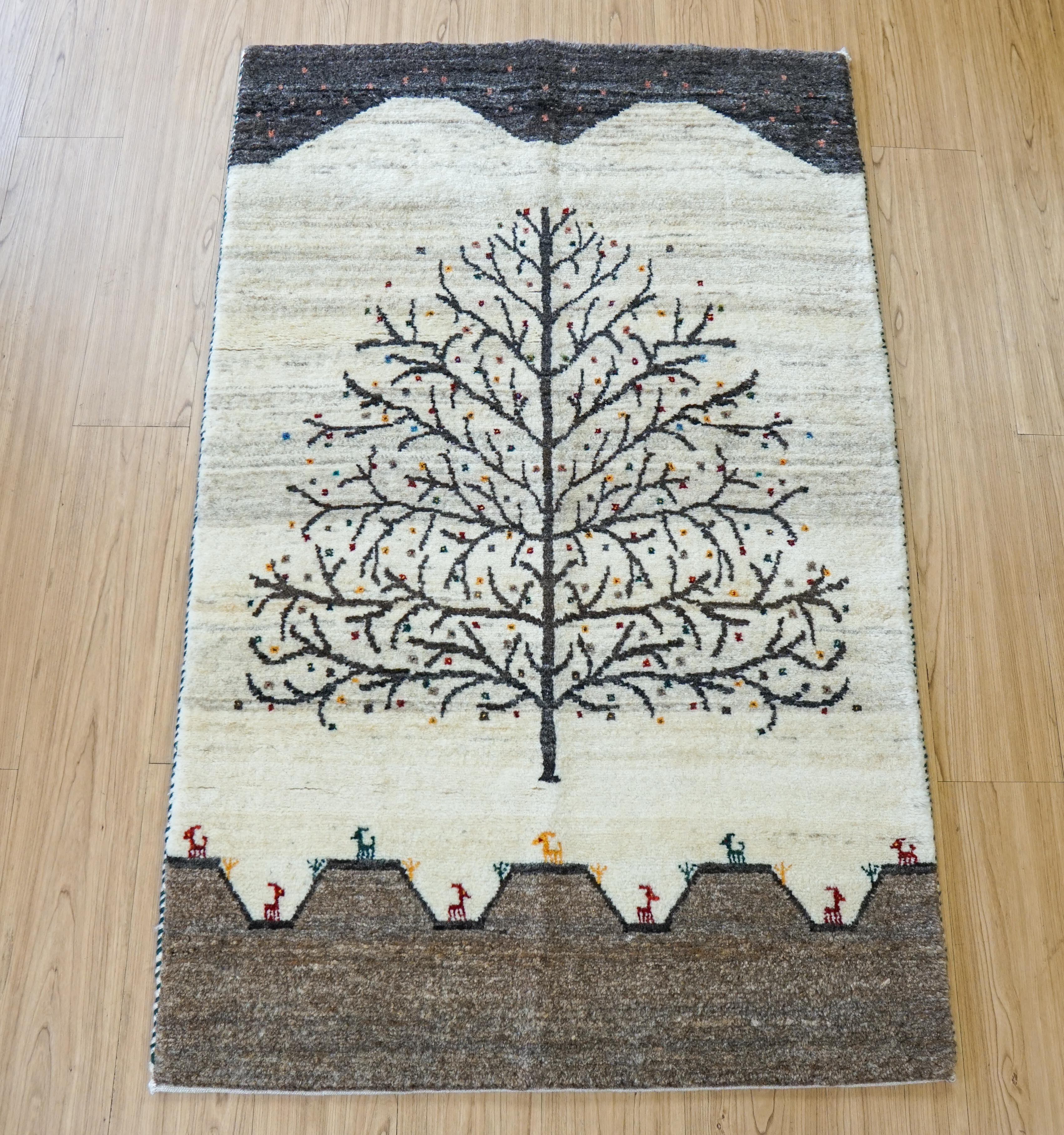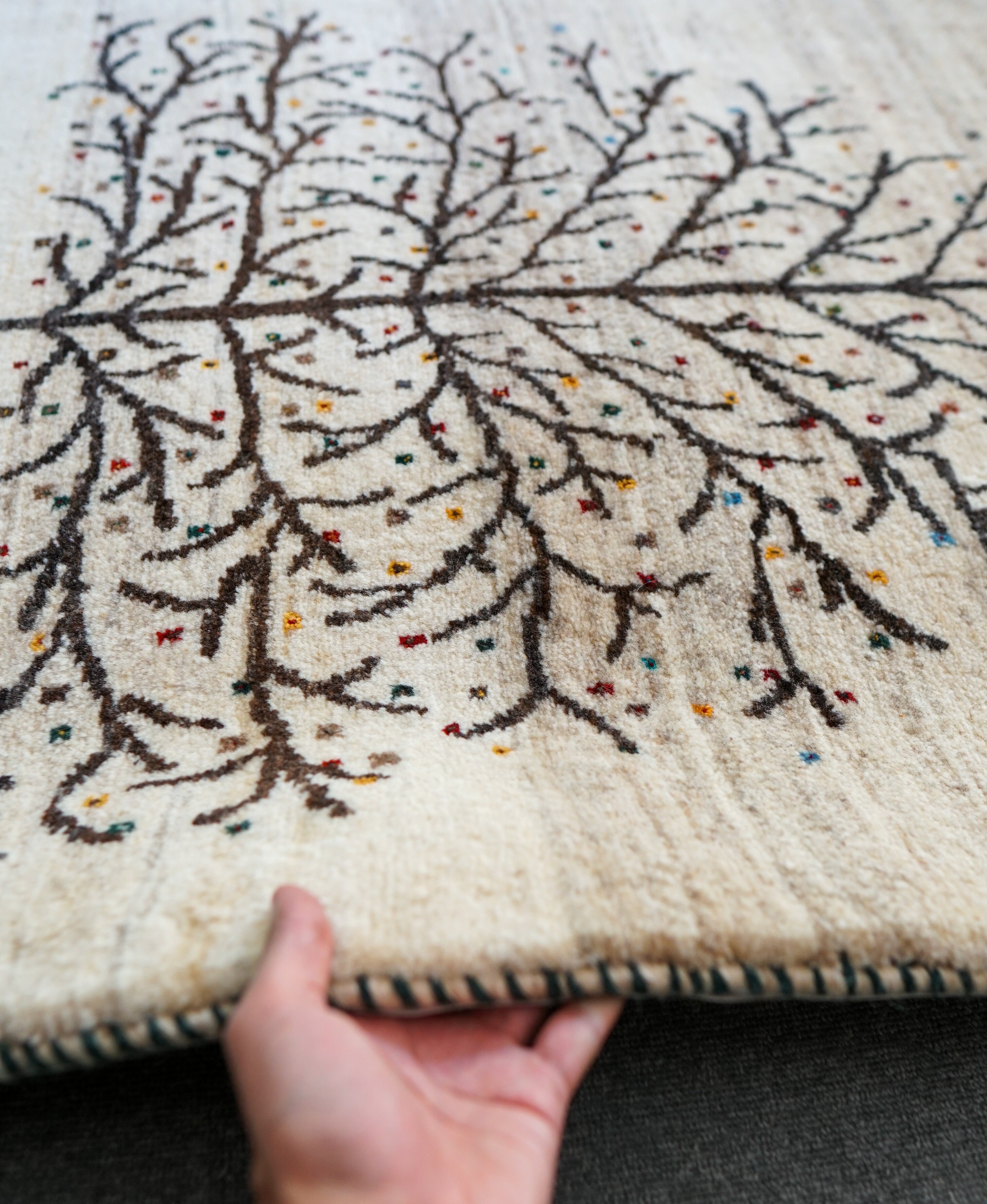 イラン シラーズ地方で遊牧民族によって手織りされたギャッベ。ギャッベの中でも織りが細かい『カシュクリ』と呼ばれるグレードの高いものです。結び目の密度が高いため織り上げるのに一般的なギャッベより時間を要しますが、柄は鮮明になり踏み心地も抜群です。
