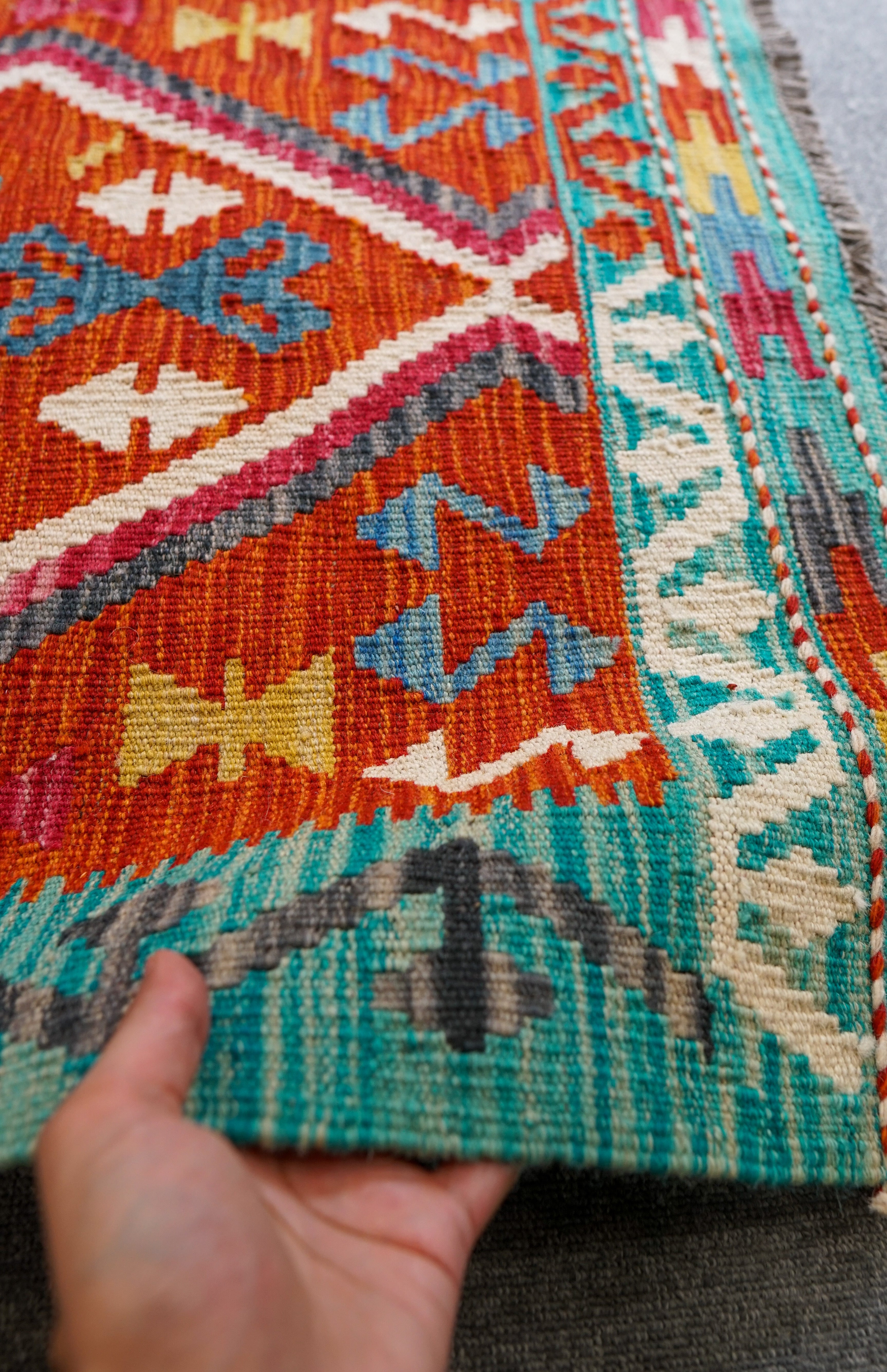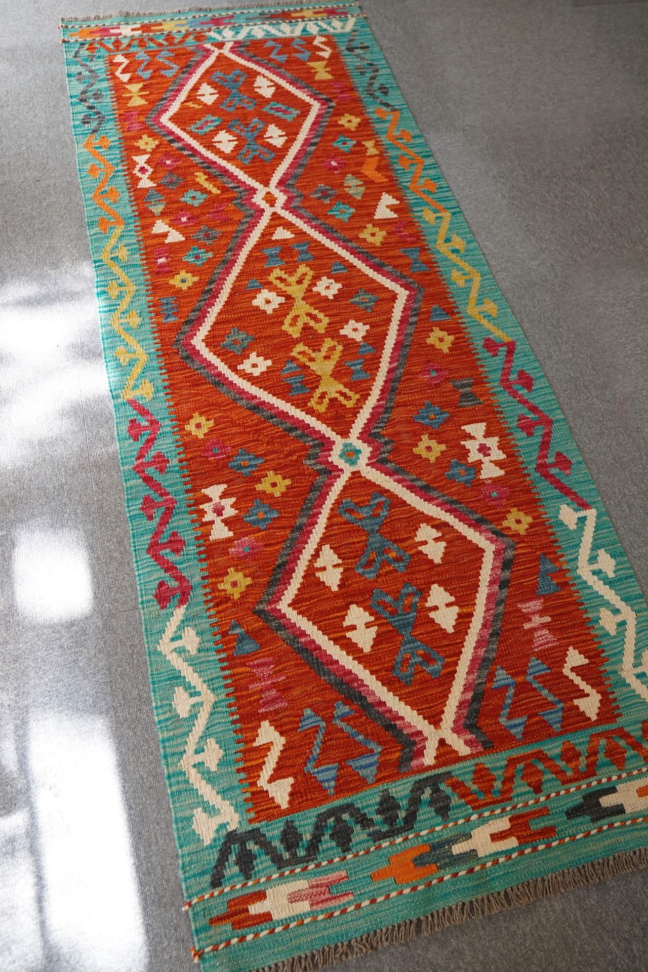 アフガニスタン中央の山間部で生活する遊牧民によって織られたキリム。キリムとは、トルコ、イラン、アフガニスタンを主な産地とする毛足のない平織りのトライバルラグで、汚れれば水洗いをし、破れれば修理をしたり袋物に作り変えたりと現地では大切に使われています。