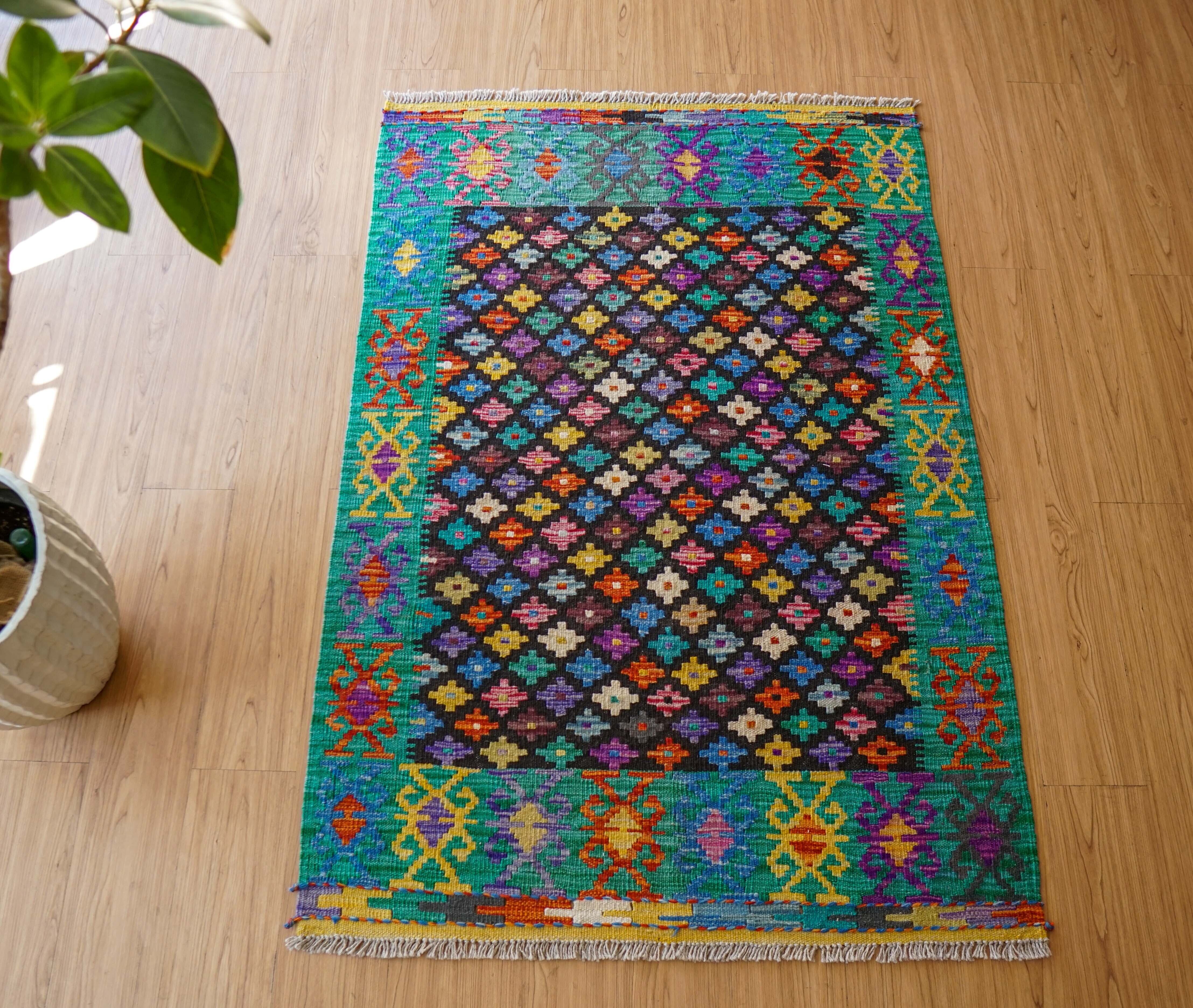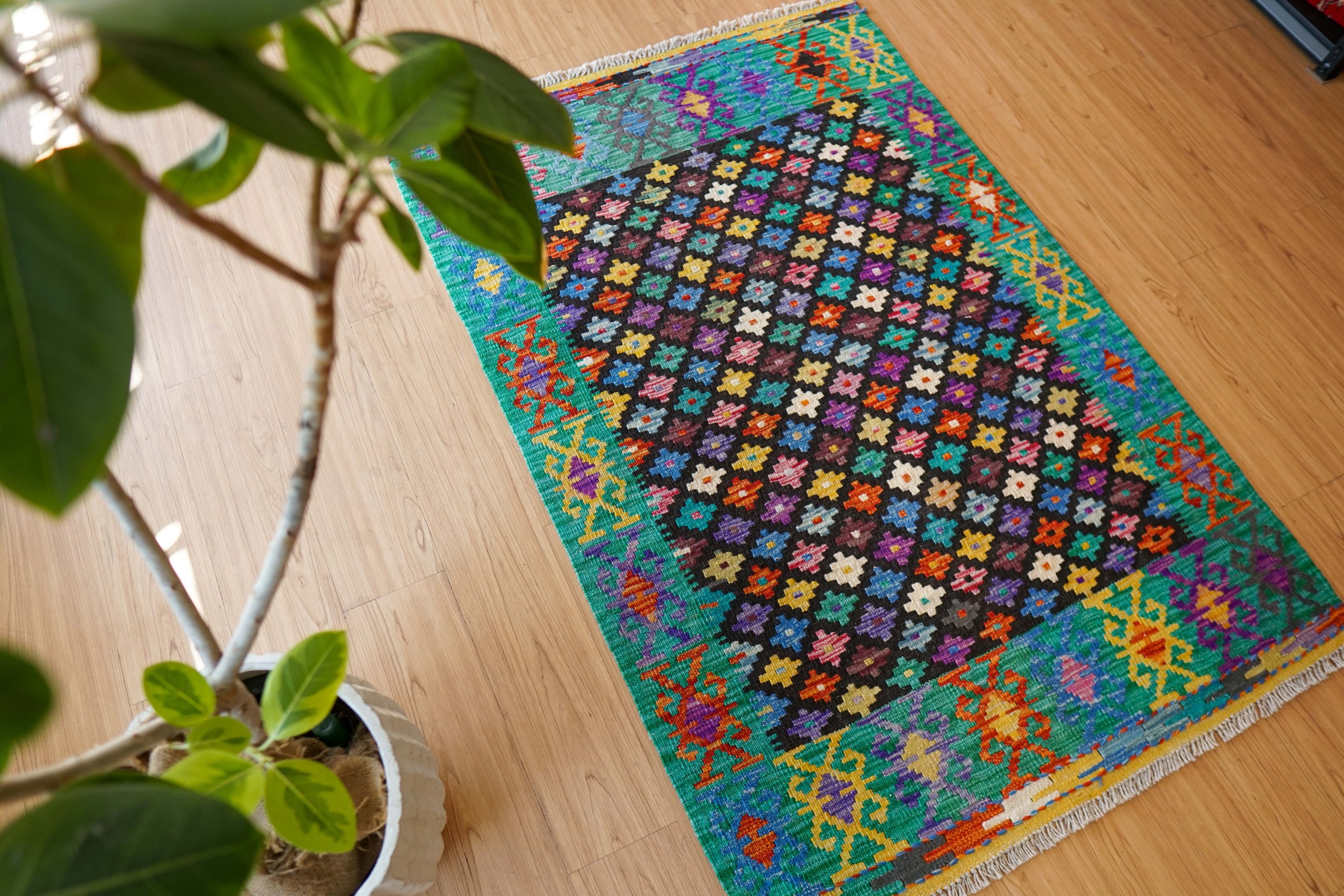アフガニスタン中央の山間部で生活する少数民族のマイマナ族によって織られたキリム。キリムとは、トルコ、イラン、アフガニスタンを主な産地とする毛足のない平織りの絨毯で、汚れれば水洗いをし、破れれば修理をしたり袋物に作り変えたりと現地では大切に使われています。