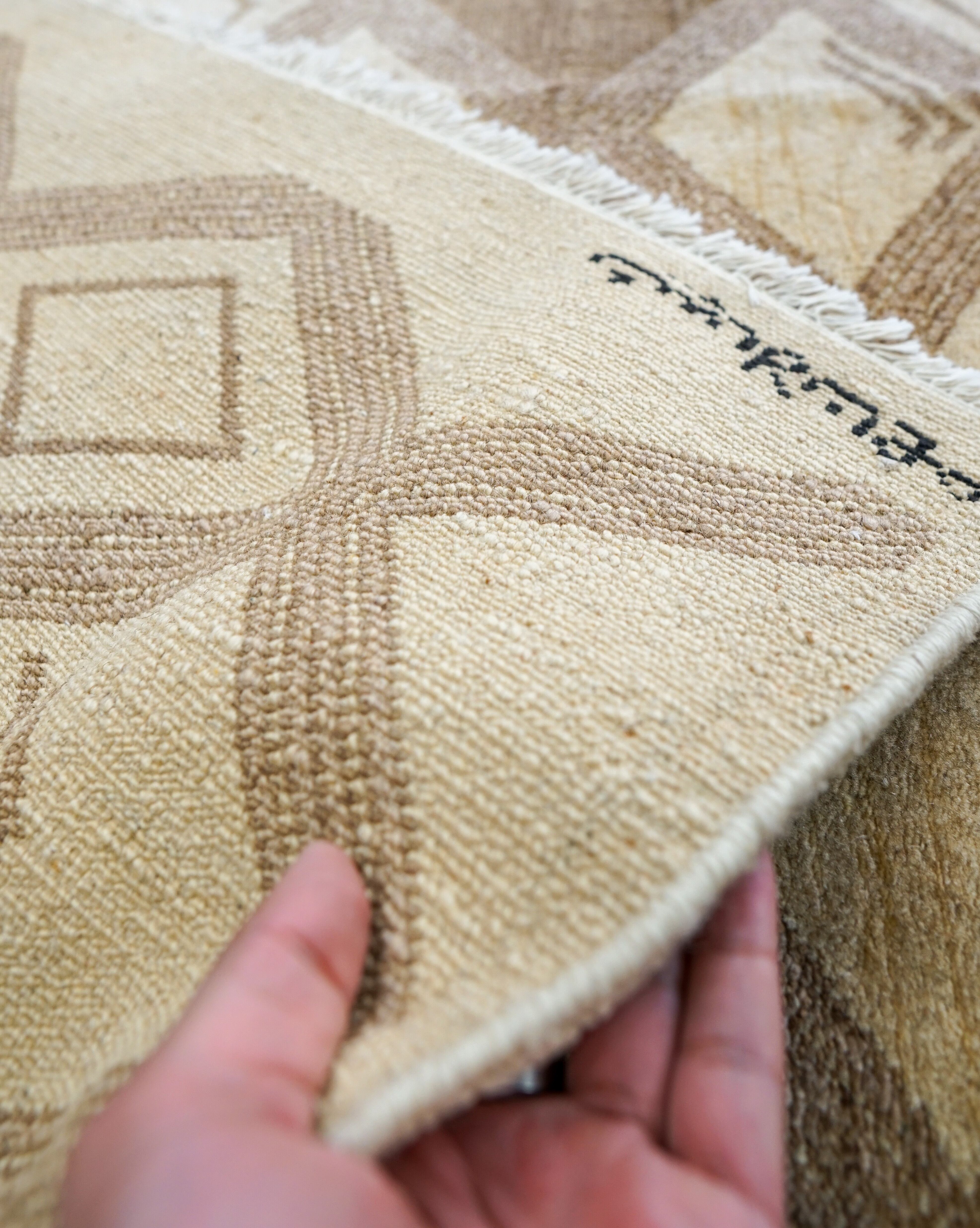 手紡ぎウールは、機械で紡いだウールより色に不均一さが出て、素朴で可愛らしく、よりナチュラルな印象の絨毯に仕上がります。アンティークな雰囲気をもつことからヨーロッパでも人気の種類です。ペルシャ産のギャッベと比較して厚さは若干薄めです。