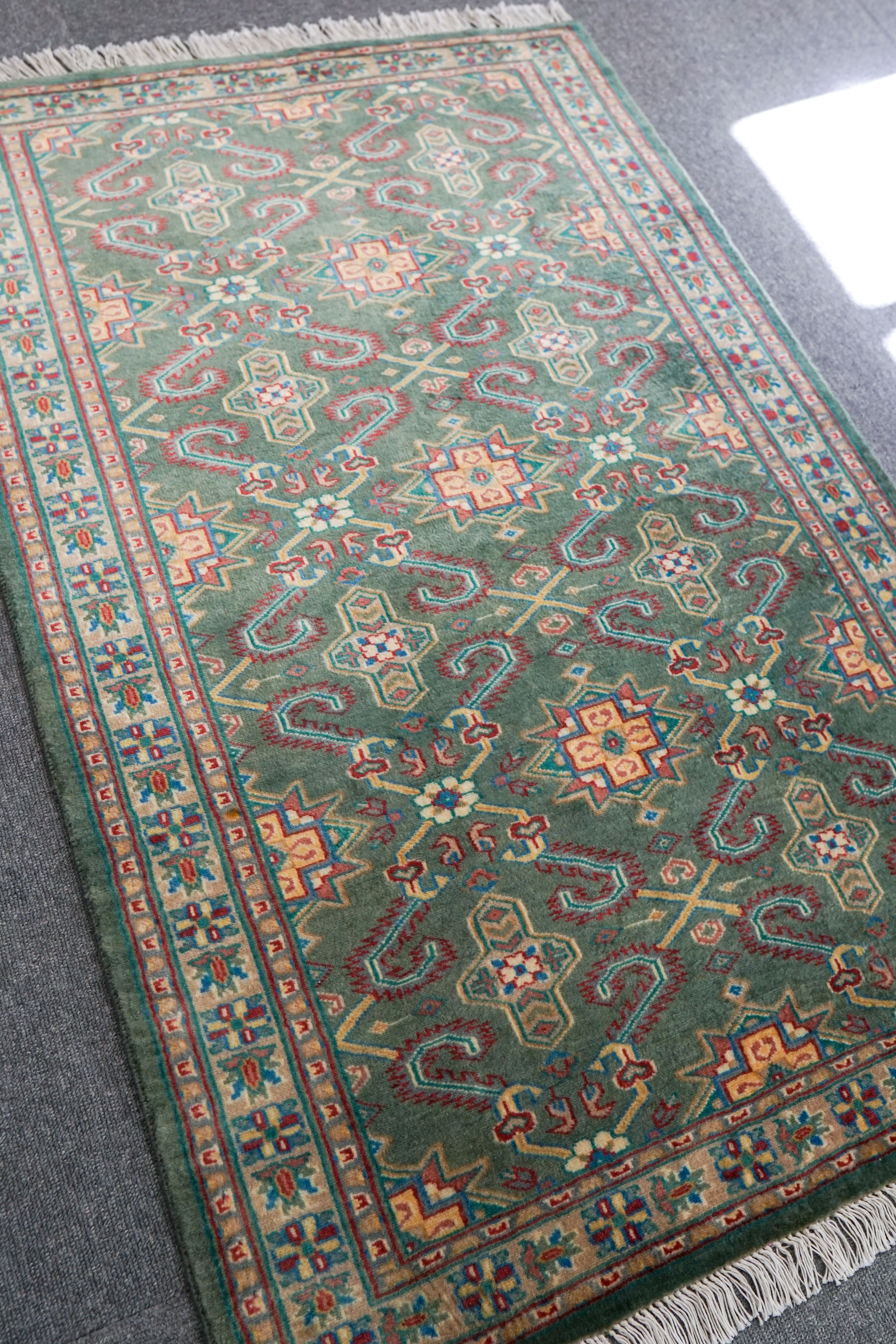 ニュージーランド産の上質なウールをたっぷり使用し、手織りで作り上げたパキスタン絨毯です。肌触りはなめらかで柔らかく、表面にはハリ・ツヤがあります。
